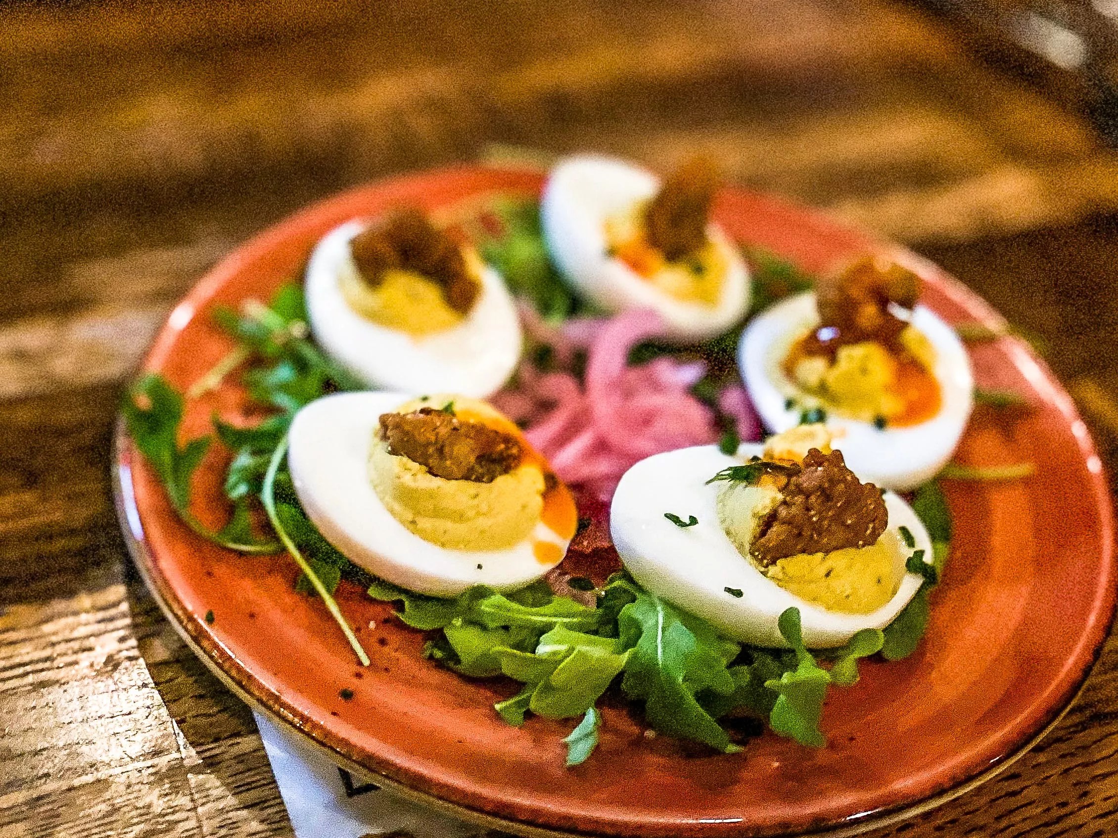 For starters, we tried the deviled eggs, which were lovely little things, served five to an order. The main star was a chunk of crispy chicken skin on top, along with dill and hot sauce. These were very good, but there were two of us and five servings. That last one sat there as neither of us wanted to be the greedy one until I made the supreme sacrifice and finished it off.