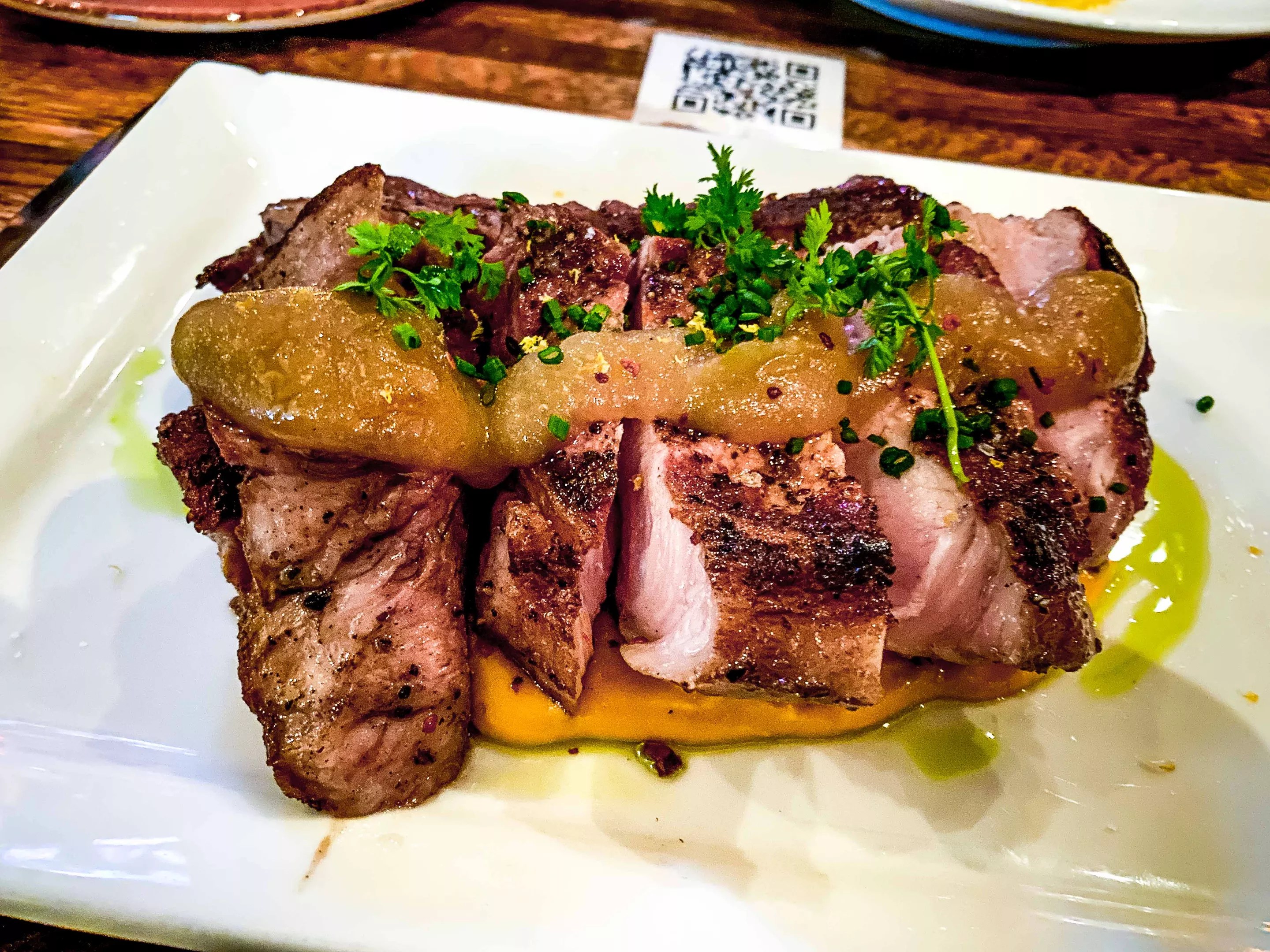 Our mains included the wood-grilled Wagyu Teres Major (photo at top) and the Heritage Berkshire pork chop, both reasonably priced at under $40 somehow. The steak came in three little pieces, which sat upon a parsnip purée and came with some grilled leeks and a pomegranate demi-glace. Nicely done.