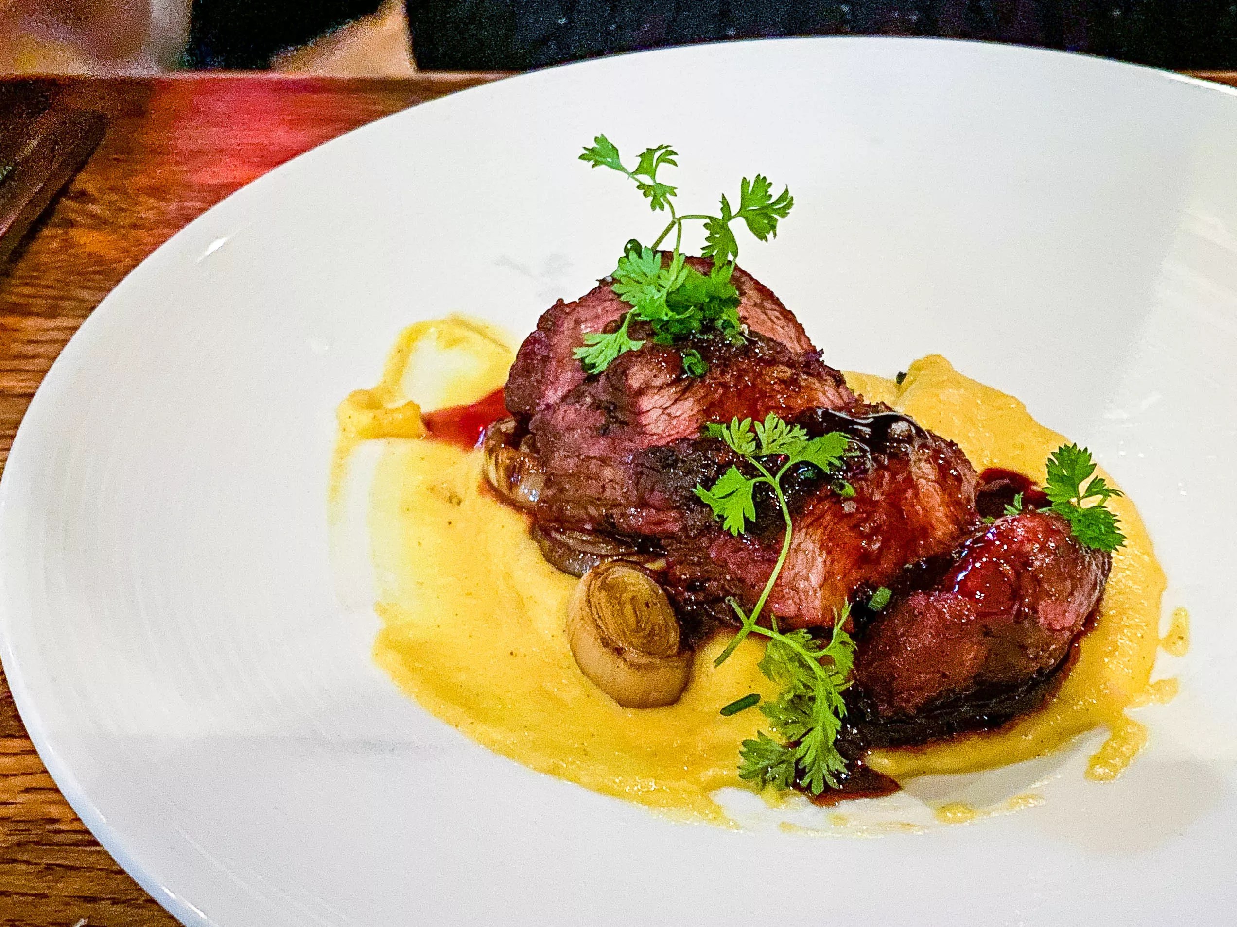 The pork chop got the purée treatment as well, this time of the sweet potato variety, and was surrounded by a ringlet of green oil. Medium-rare was perfect, and even though it was pork. It was also presliced off the bone, but the bone was left on the plate and provided some of the best meaty morsels of the meal.