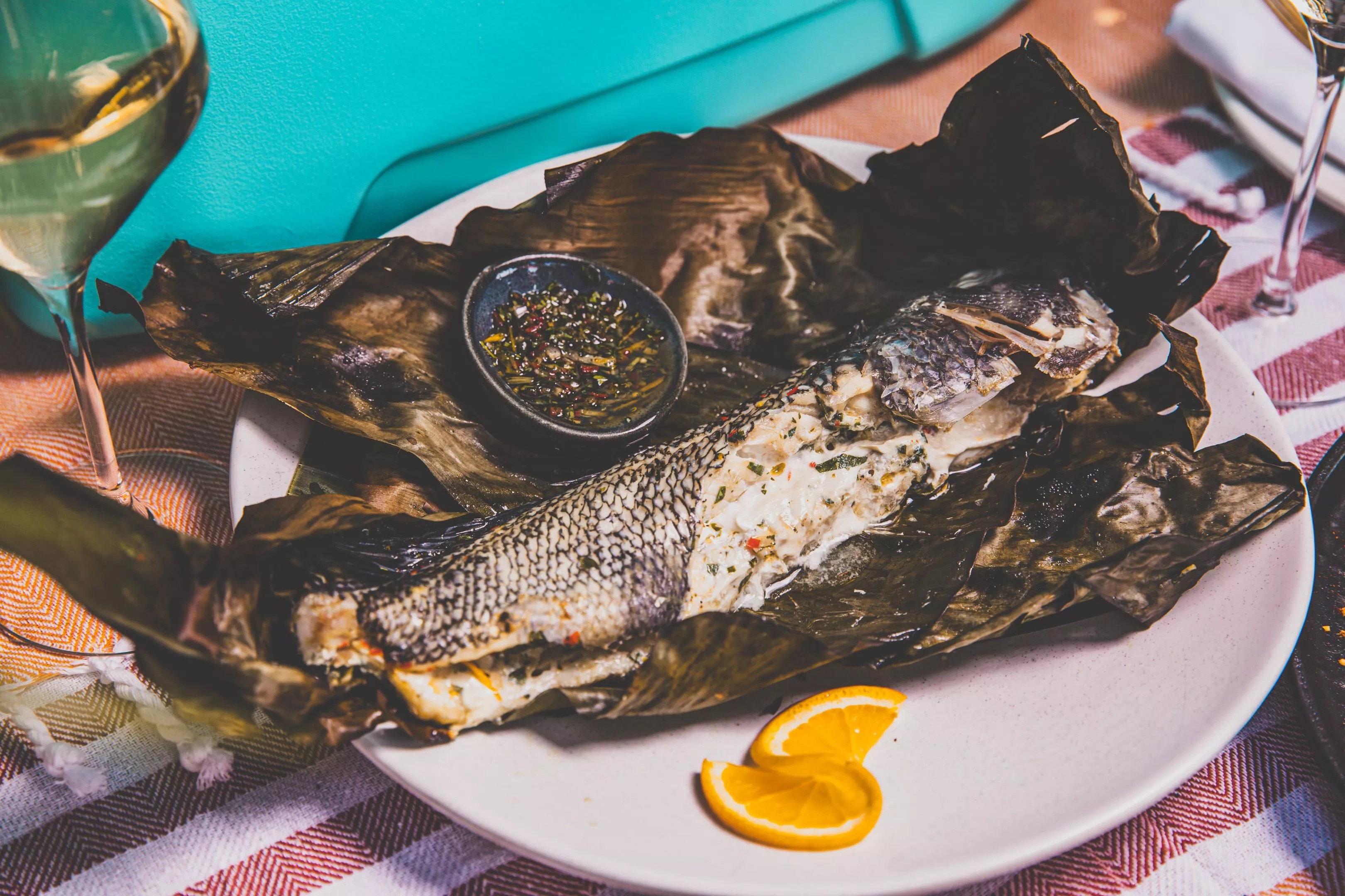 A whole fish comes wrapped in banana leaves.
