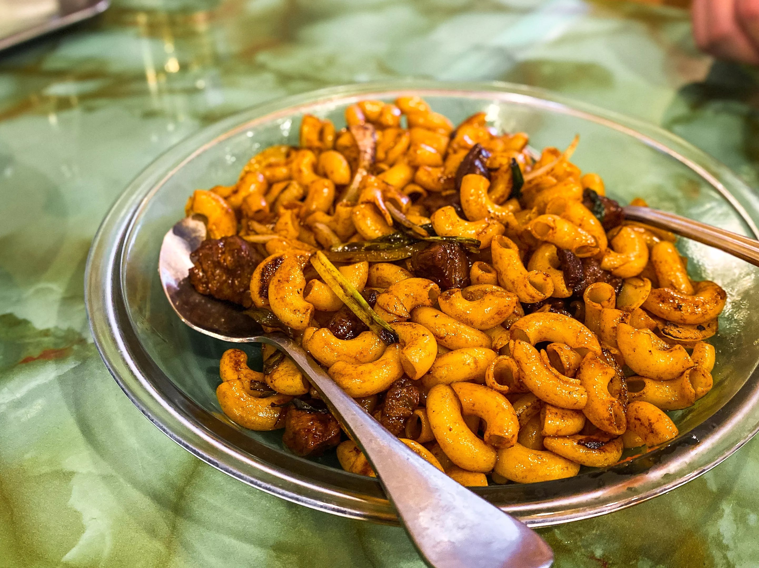 Finally, we had to try the nui xao bo (tenderloin) stir-fried macaroni thing, as it sounded intriguing. The elbow macaroni at first seemed an odd choice, but evidently it serves the same purpose that rigatoni’s ridges serve in pasta cooking: the sauce and flavor get infused into the pasta better, intensifying the flavors while also making it a bit easier to eat for those of us who are constantly working on our chopstick skills. The beef was tender and delicious; it really did seem to be tenderloin. Sliced onions rounded out this dish, and it is definitely something we’d order again.