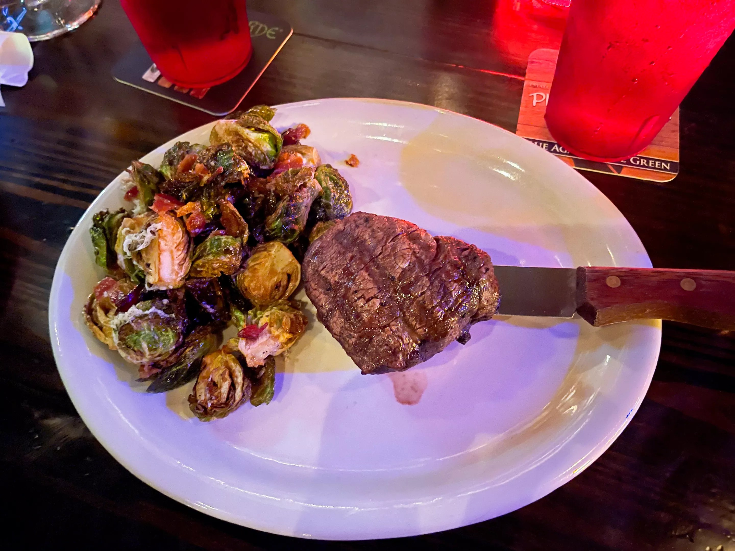 There’s a tempting chopped steak sandwich with grilled onions and bell peppers on a sourdough bun ($11.99), but when we asked our friendly bartender about it, he said, “If you want something good, get the steaks.” We trusted him, but we still want to try that sandwich.