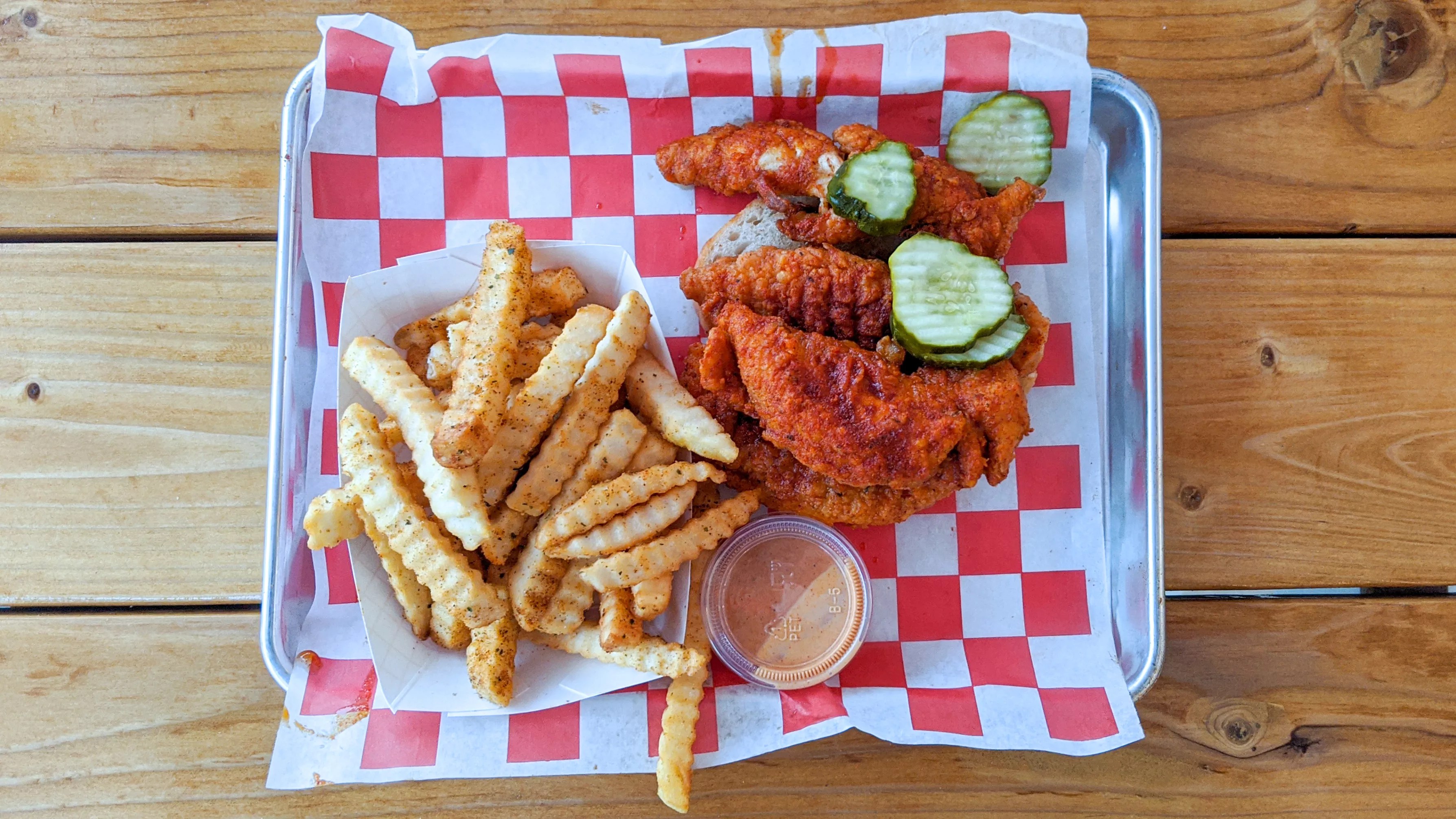 The tenders and wings plates come piled on top of white bread, which sops up the extra spice blend, a Nashville hot chicken tradition. The seasoned fries were excellently crispy crinkle cuts tossed in a delicious spice blend that paired well with the smokey Comeback sauce.