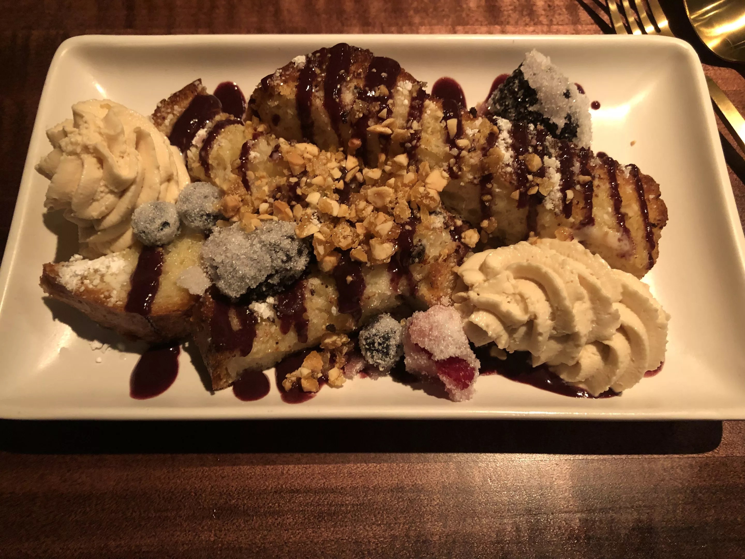 Assuming you have room for dessert, we recommend closing out with the peanut butter jelly thyme, a plate of challah french toast, topped with creme anglaise, mixed-berry thyme compote, crystallized berries and candied peanuts, garnished with peanut butter cream cheese mousse ($10).