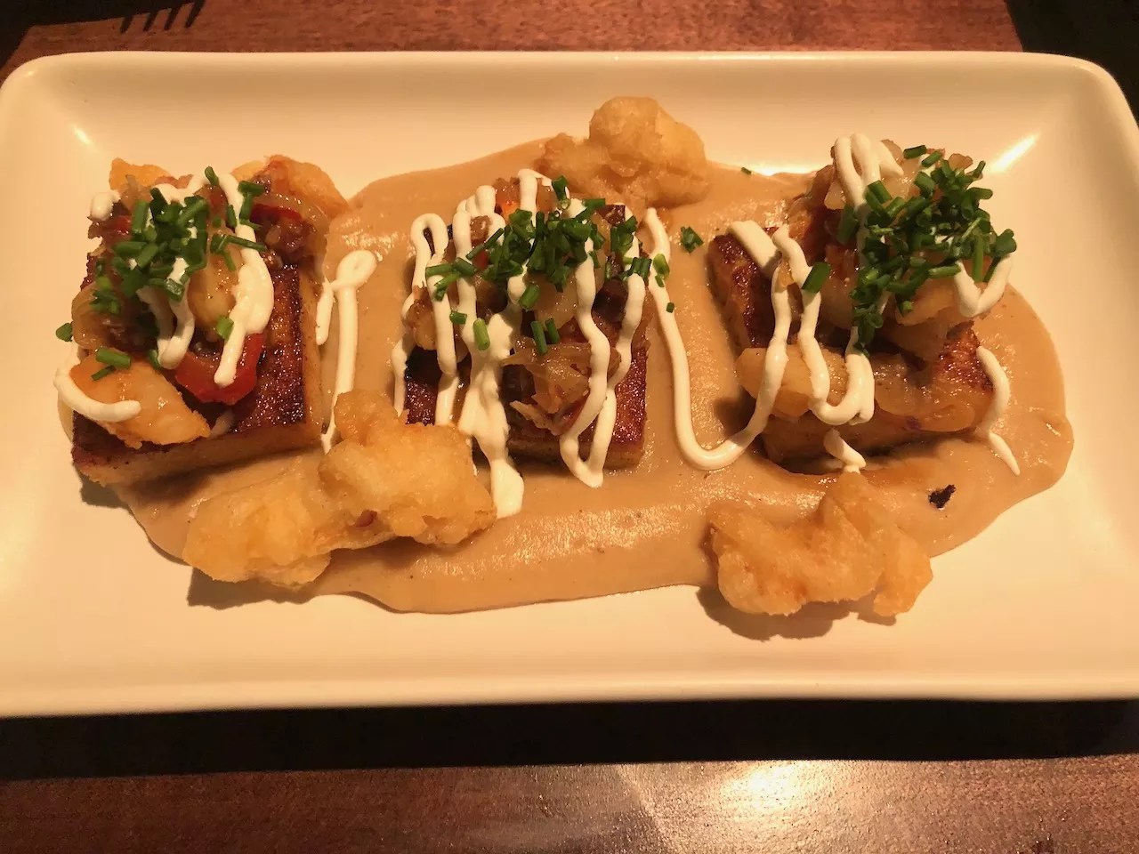 If you’re looking to fill up on a larger dish, the cacio e pepe is an indulgent plate of yolk pasta made in-house mixed with rio fresh beet marinara, mushrooms, goat cheese, arugula, vegetarian chorizo, basil-english pea puree and microgreens ($17).