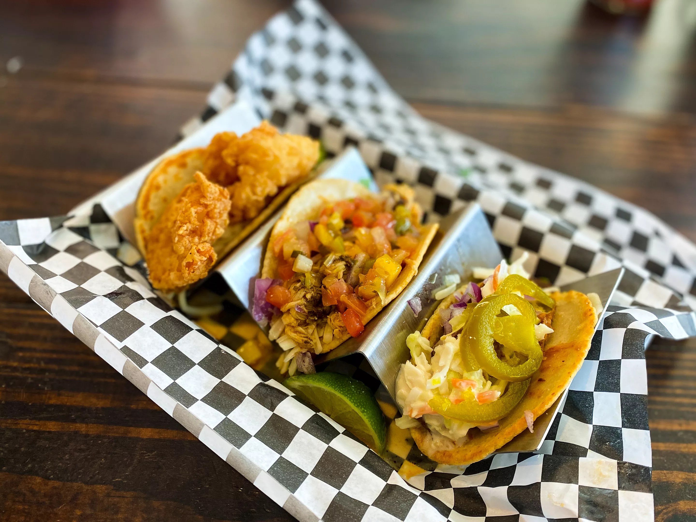 A trio of tacos: shrimp, jerk chicken and BBQ Hennessy pulled pork.