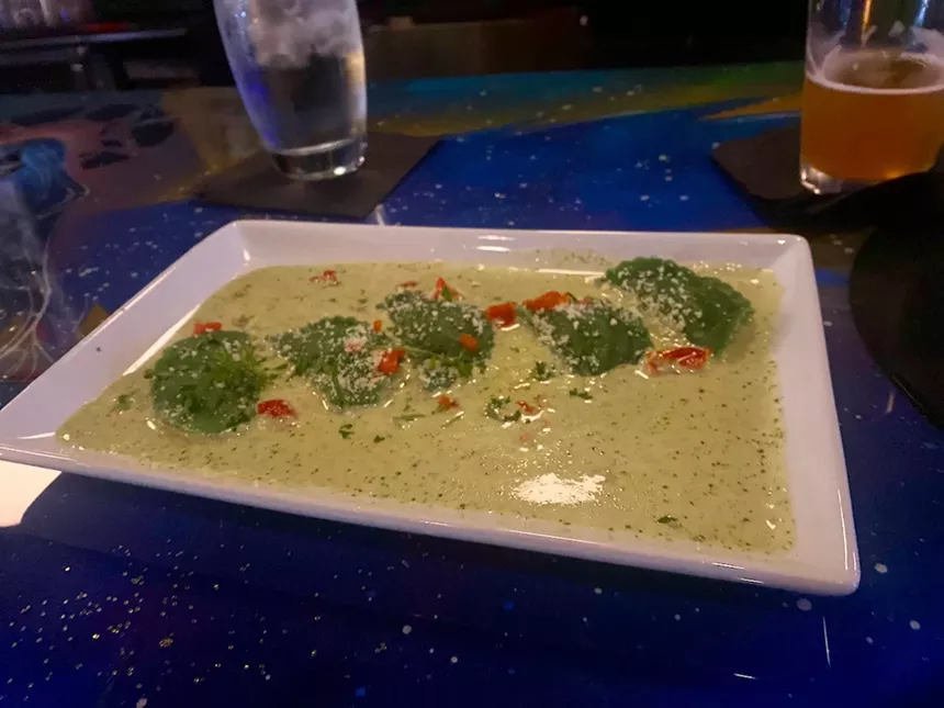 Our plate of goat cheese stuffed spinach agnolotti came with a velvety rich pesto cream sauce ($12). An order of the daily special, a poblano lasagna in a white sauce, on a nearby table looked scandalous. And we overheard another table praise the from-scratch minestrone soup. We got an order of the $20 spaghetti and meatballs to go and it was quickly devoured without complaint.