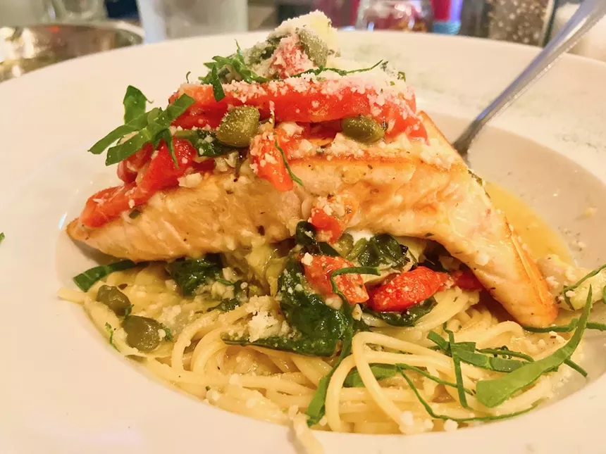 The salmon piccata , a nightly special, is a huge filet of salmon is served with sweet red peppers, capers, artichokes, and spaghetti over spaghetti in a lemon butter garlic sauce.