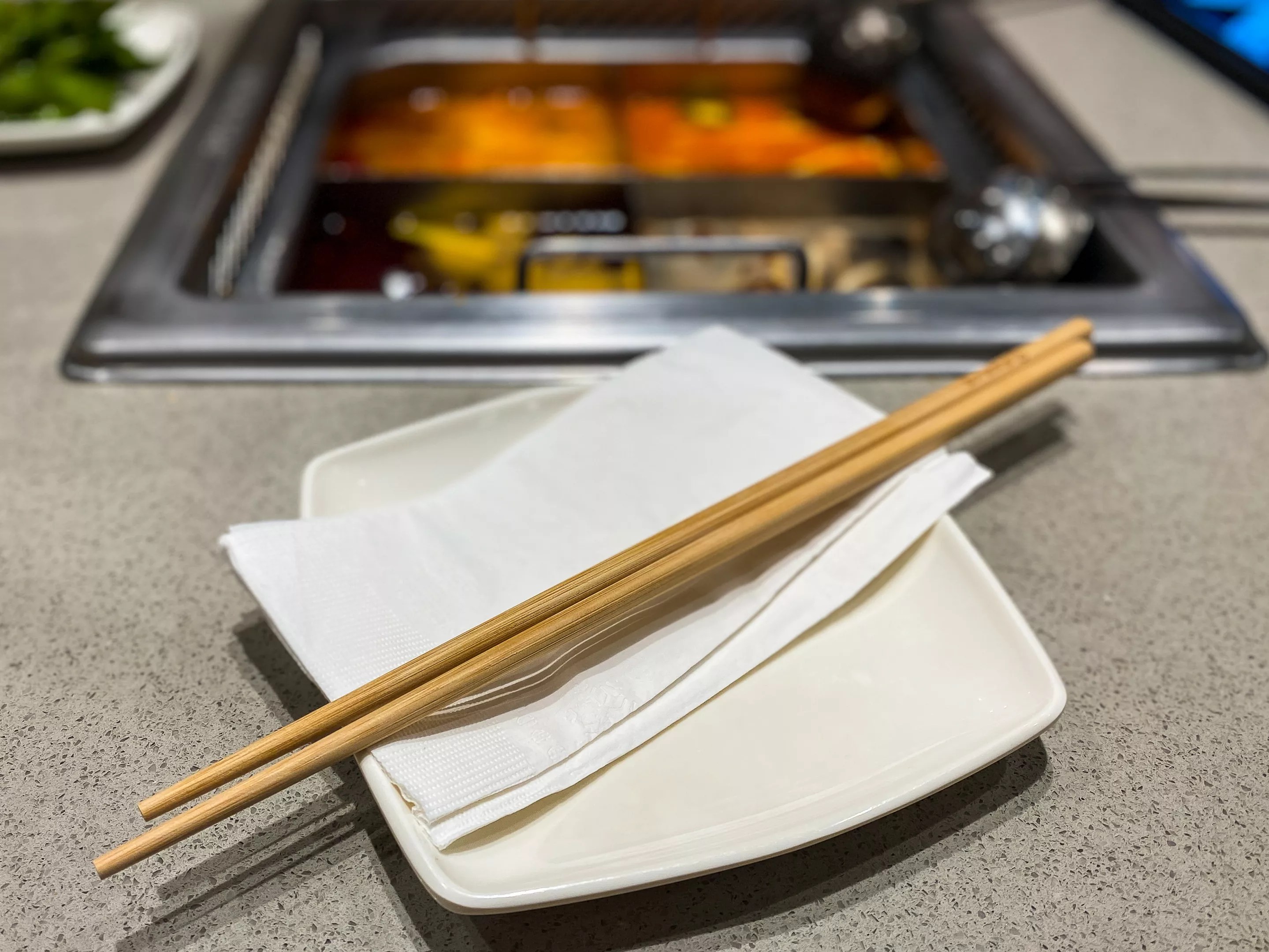 Having decided on the soup bases, we moved on to what we’d actually simmer in them. For proteins we opted for chicken, white shrimp and a lean and fatty Angus beef mix. These were all about $10 each. Spinach and broccoli were selected for veggies ($3 each), and vermicelli and dancing noodles rounded out our order. Evidently, the dancing noodles are prepared by a “noodle dancer” who hand-pulls the noodles tableside. Exciting! Until we learned that the noodle dancer had the night off. Oh well. They subbed a small order of noodles gratis to make up for our immense disappointment of not getting to see the noodle dancer. We carried on.