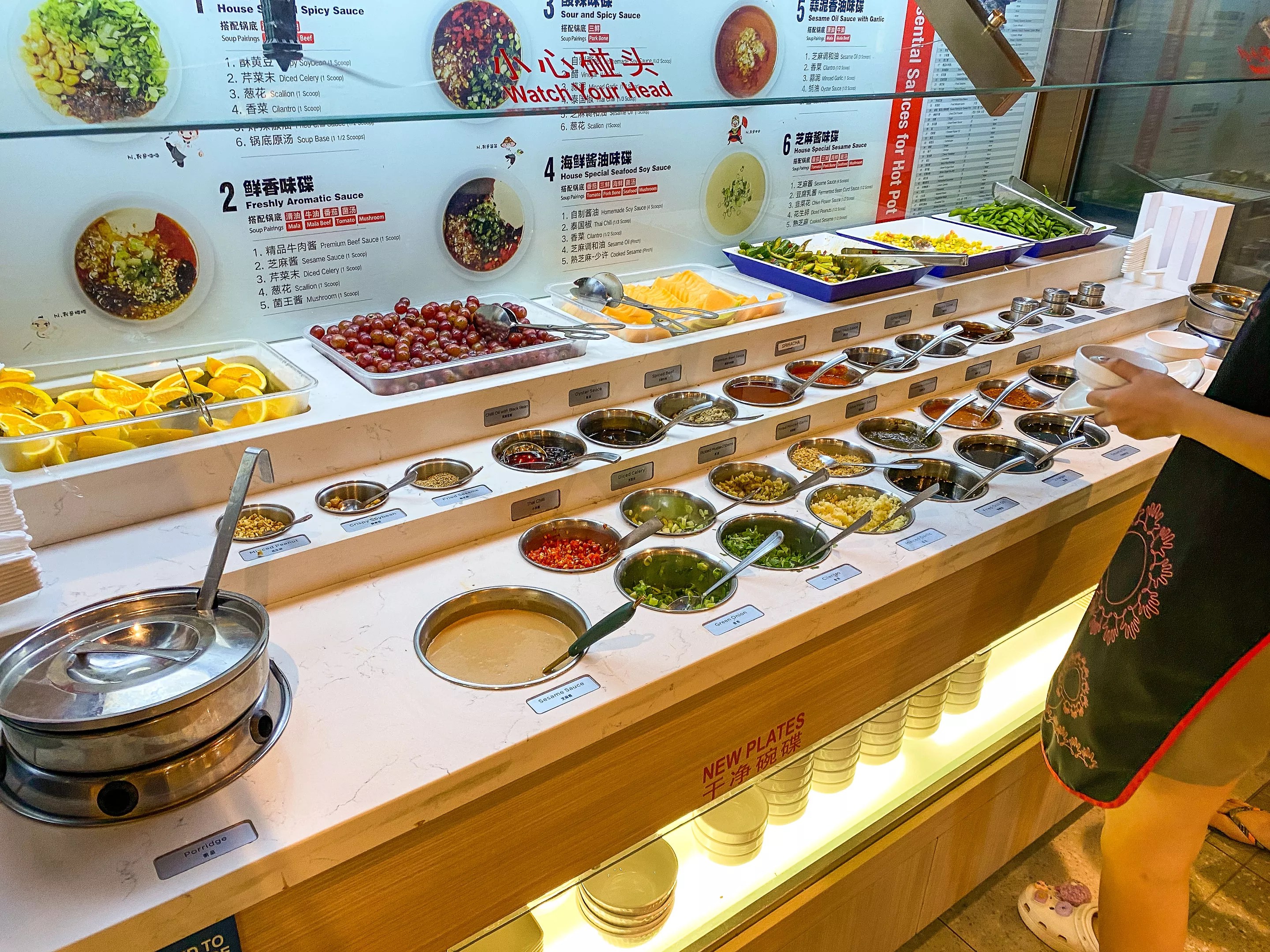 For an additional $1.99, one can make use of the sauce bar, which allows unlimited trips to this sideboard where one can prepare different types of dipping sauces using a large variety of fresh ingredients available, such as chili oil, fresh garlic, cilantro, sriracha sauce, chopped pickled mushrooms, diced celery, and more. They helpfully provide some recipes to aid in the creation of, say, the house special spicy sauce. This is very reminiscent of the sauce stations at Mongolian barbecue places. Some fresh fruit, edamame and porridge are also available at this station.