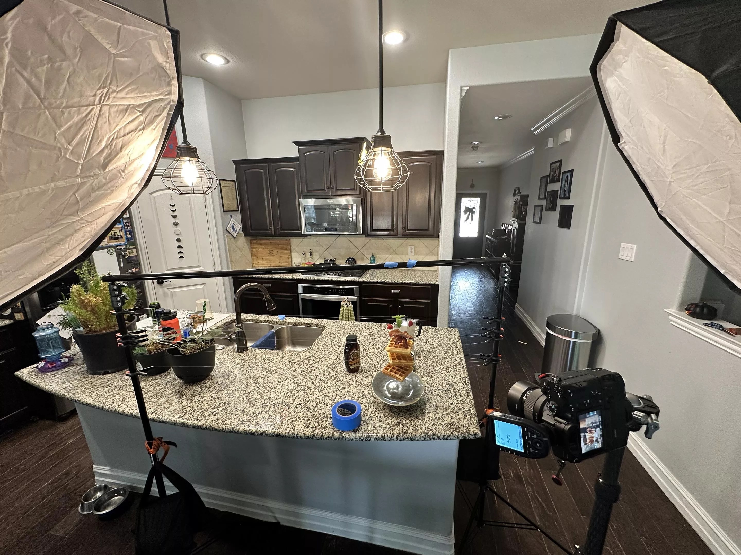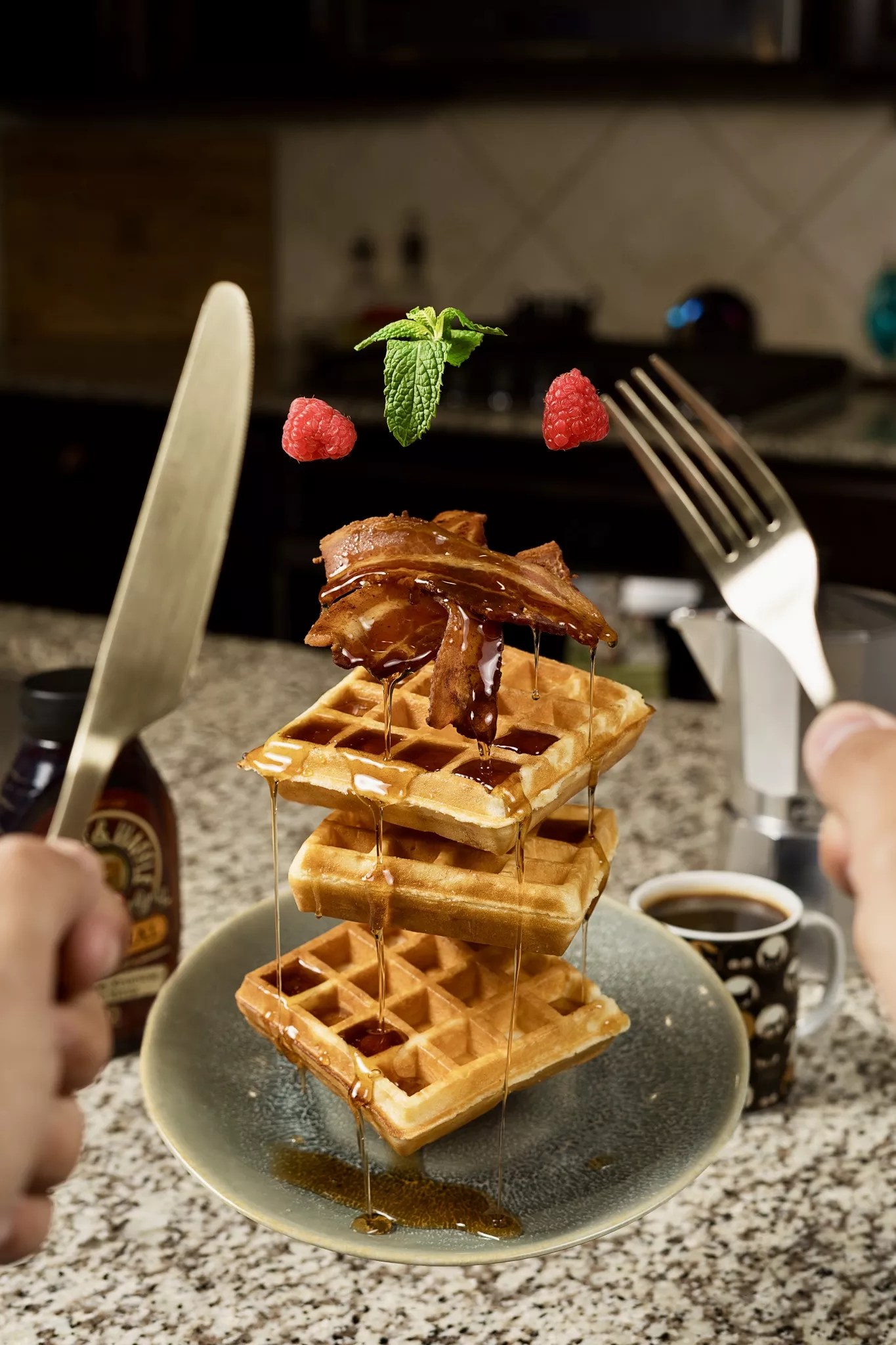 One photo in Warren’s portfolio is of “floating” waffles and, no, there wasn’t one magic shot. The photo is made up of several separate images, all individually shot. The floating food was held up by fishing wire
