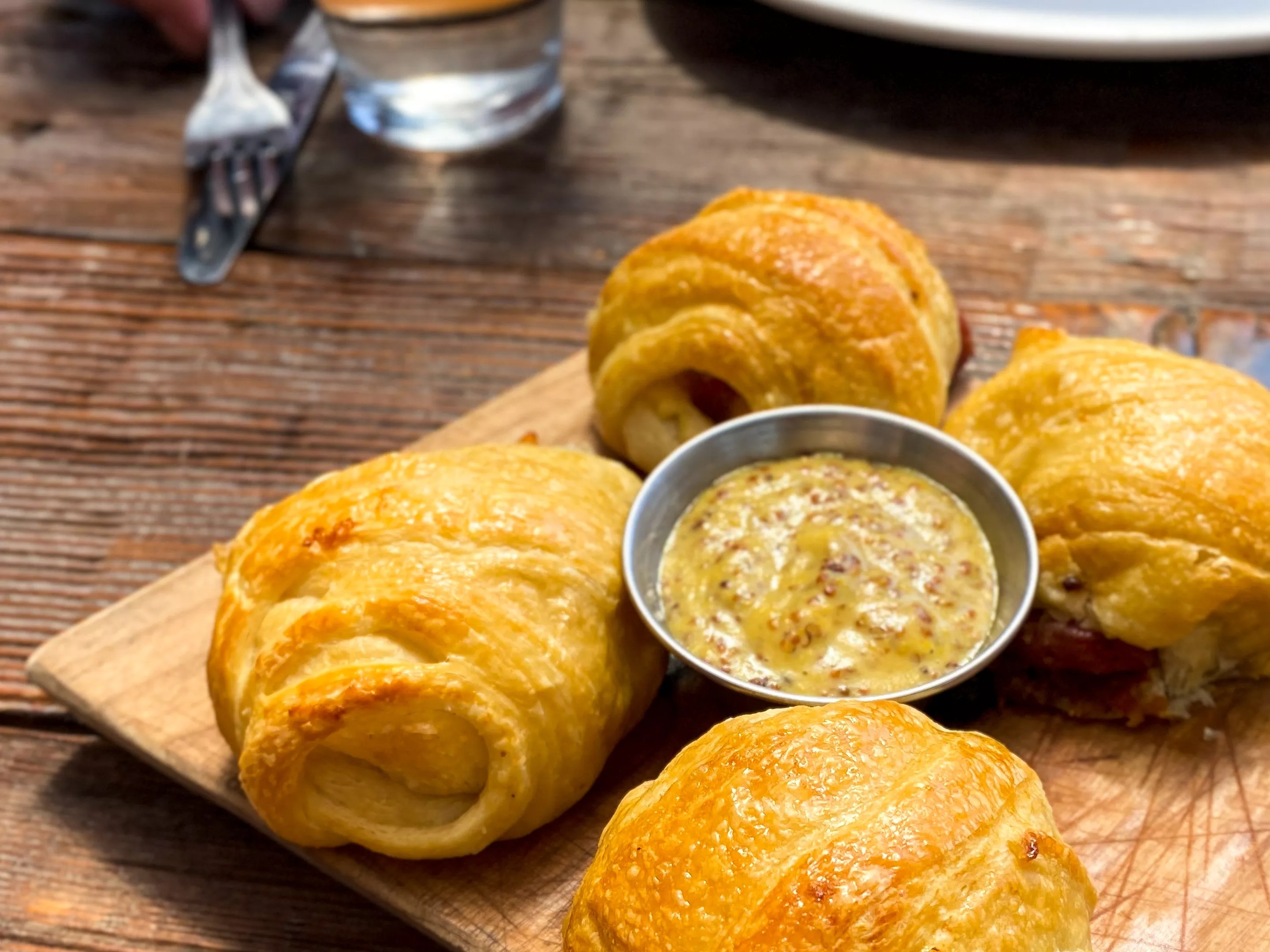 The puppy was still bounding around the space when our pigs in puff pastry arrived. These little darlings, which come four to an order, are jalapeño cheddar sausages wrapped in a golden-brown pastry with some house mustard on the side for dipping along with some onion jam.