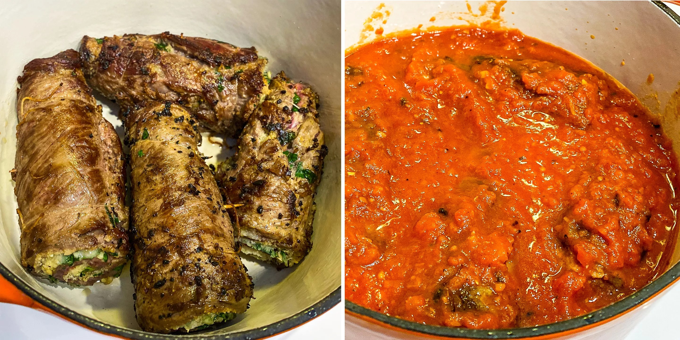 The browned rolls are placed in a baking dish and covered with tomato sauce, then braised in the oven.
