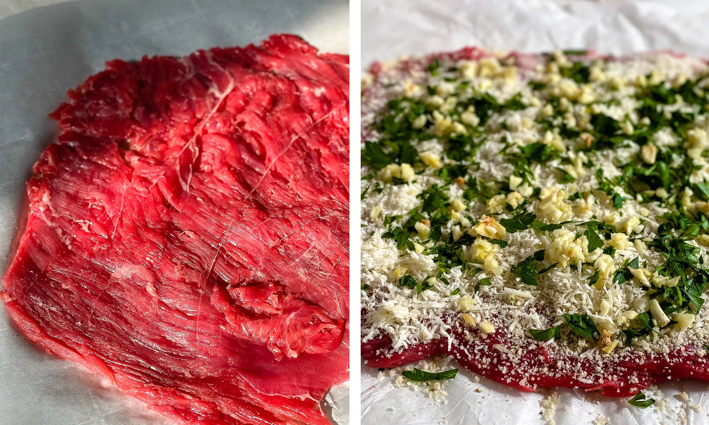 The flank steak is pounded thinly and layered with bread crumbs, cheese, parsley and garlic.