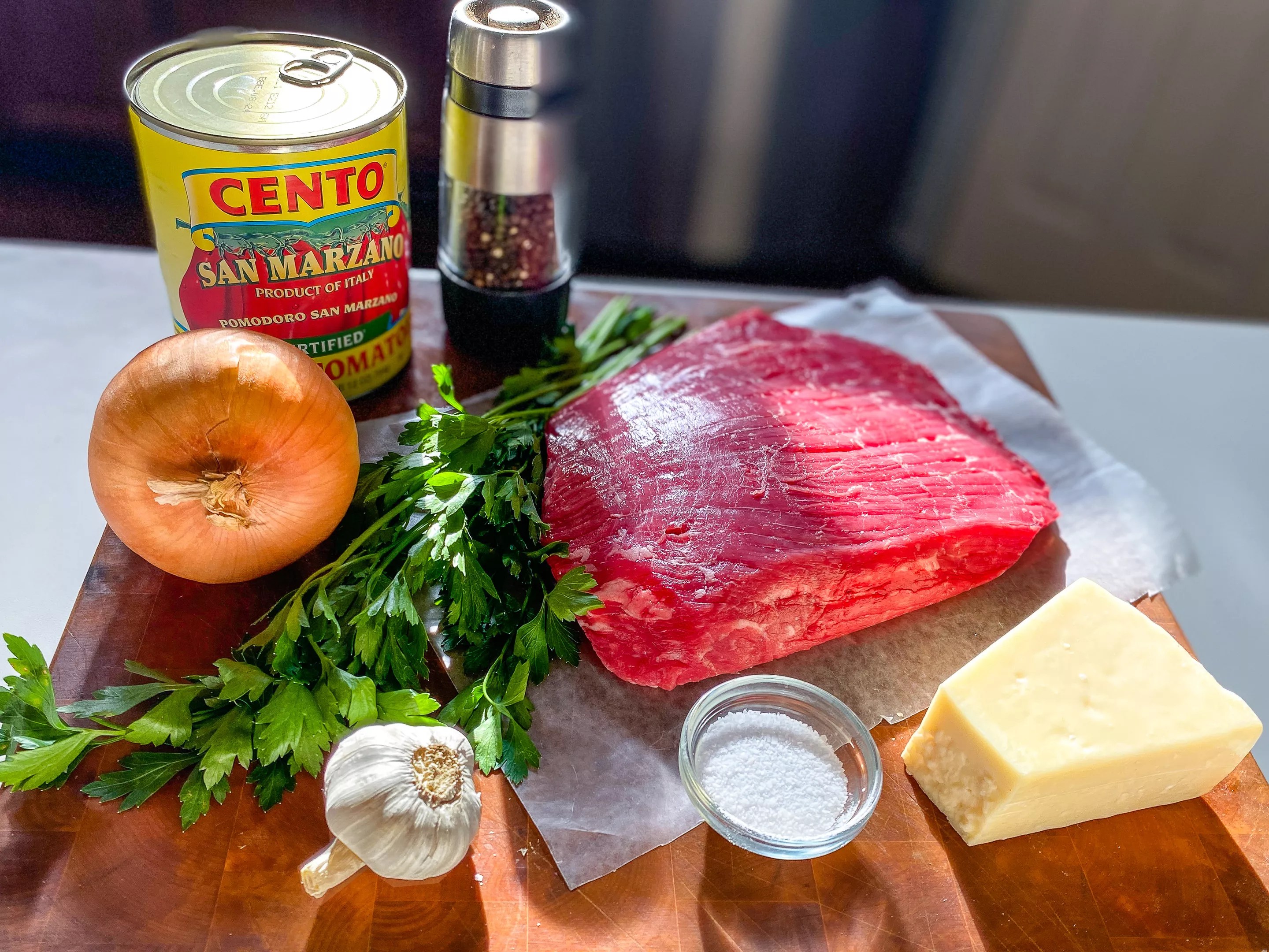 Braciole beginnings: cheese, flank steak, parsley, salt, pepper, tomatoes, garlic, onion.