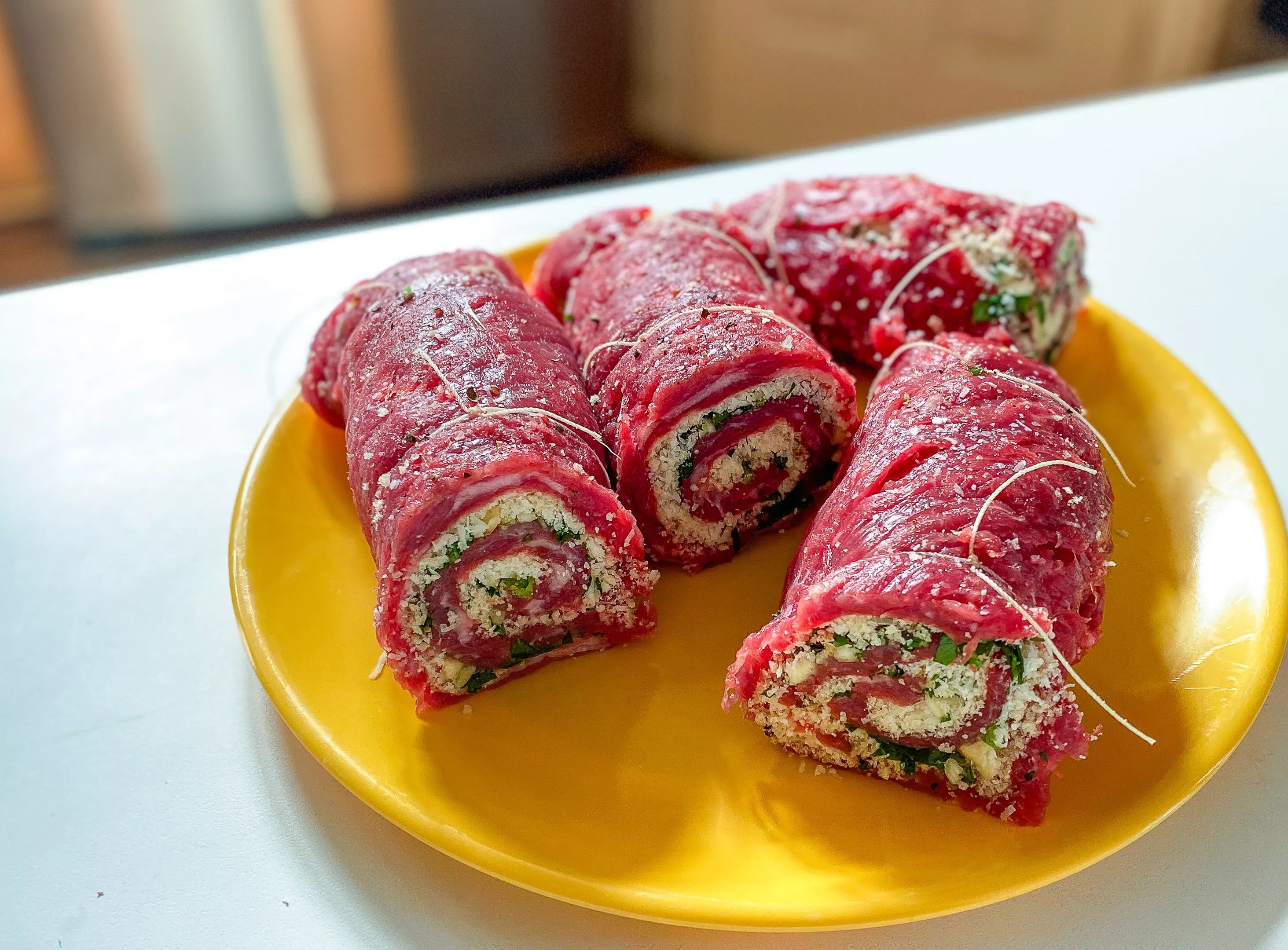 I decided to go with a sort of hybrid between my great-grandma and The Bear. Flank steak is so much better than round steak, so flank steak was used. The prosciutto called for in The Bear seems to be overkill, and an added expense that my great-grandparents would have eschewed in this dish. Breadcrumbs seem like a welcome addition – so sorry, Gram, those, too, were added. She likely would have used breadcrumbs from bread she’d baked, which she did several times a week.
