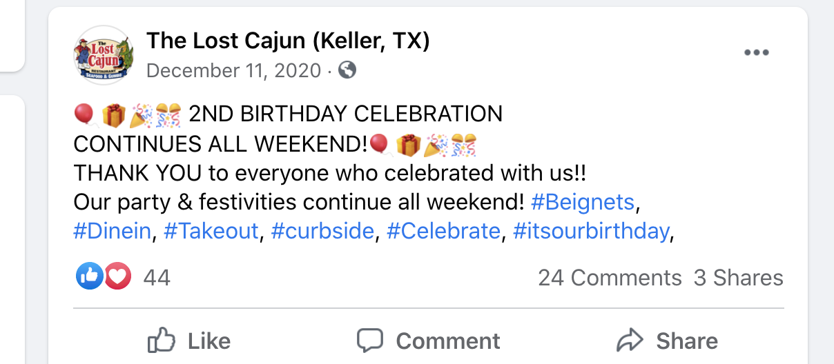 Even at the height of COVID-19 infections, when hospital capacities were on the brink, The Lost Cajun never closed and posted pictures of people dining inside their restaurant. On Dec. 11, the deadliest week of the pandemic in North Texas, the restaurant held a second-anniversary birthday bash, thanking “everyone who celebrated with us,” and saying the party and festivities would continue all weekend long.