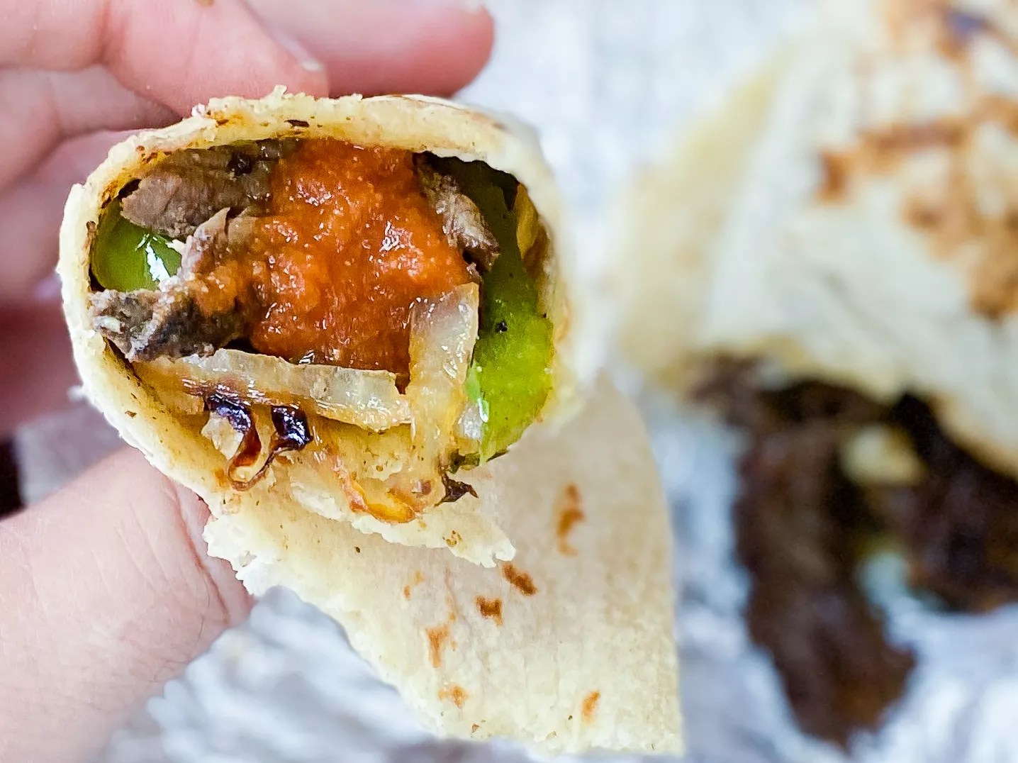 Beef fajita burrito with grilled onions and peppers with red salsa added