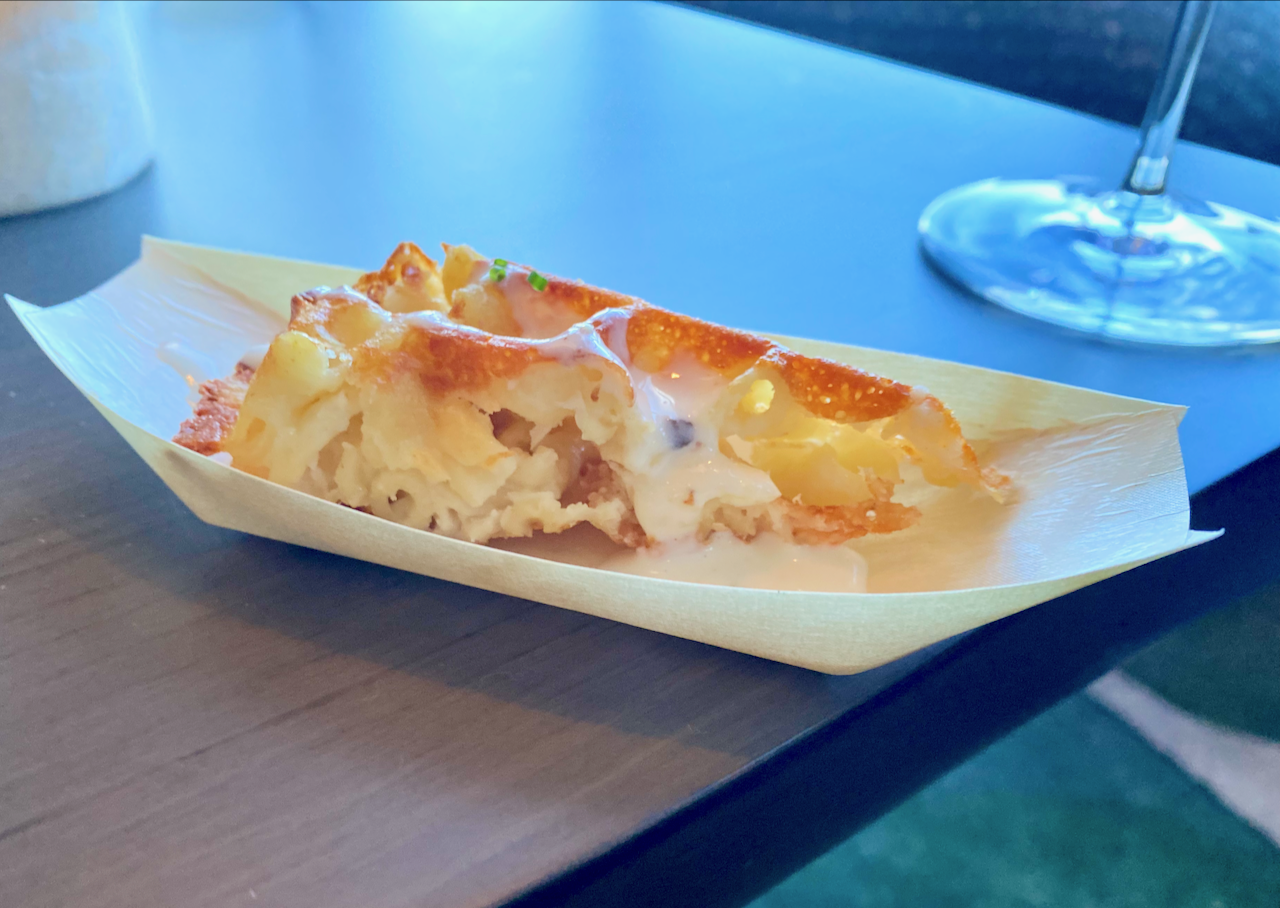Crown Block will serve steaks, seafood, plant-based fare and sushi. Steaks will be regionally sourced and the “rare steak program” specifically will offer prime beef, Texas wagyu and Japanese A5 wagyu. On Thursday we got to try small bites from the menu at a media event. One item that stuck out was a macaroni and cheese waffle with a crisp exterior and a cheesy interior.