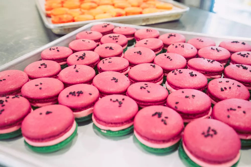 Watermelon macarons in front and mango macarons in the back are two summer flavors of macarons that are coming soon to Ollio Patisserie.