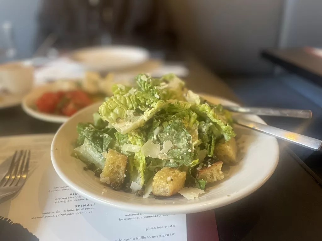 If you’re in the mood for a salad, the Caesar salad is made with little gem salad tossed with fried capers, Parmesan, pizza crust croutons and a Calabrian chile Caesar dressing.