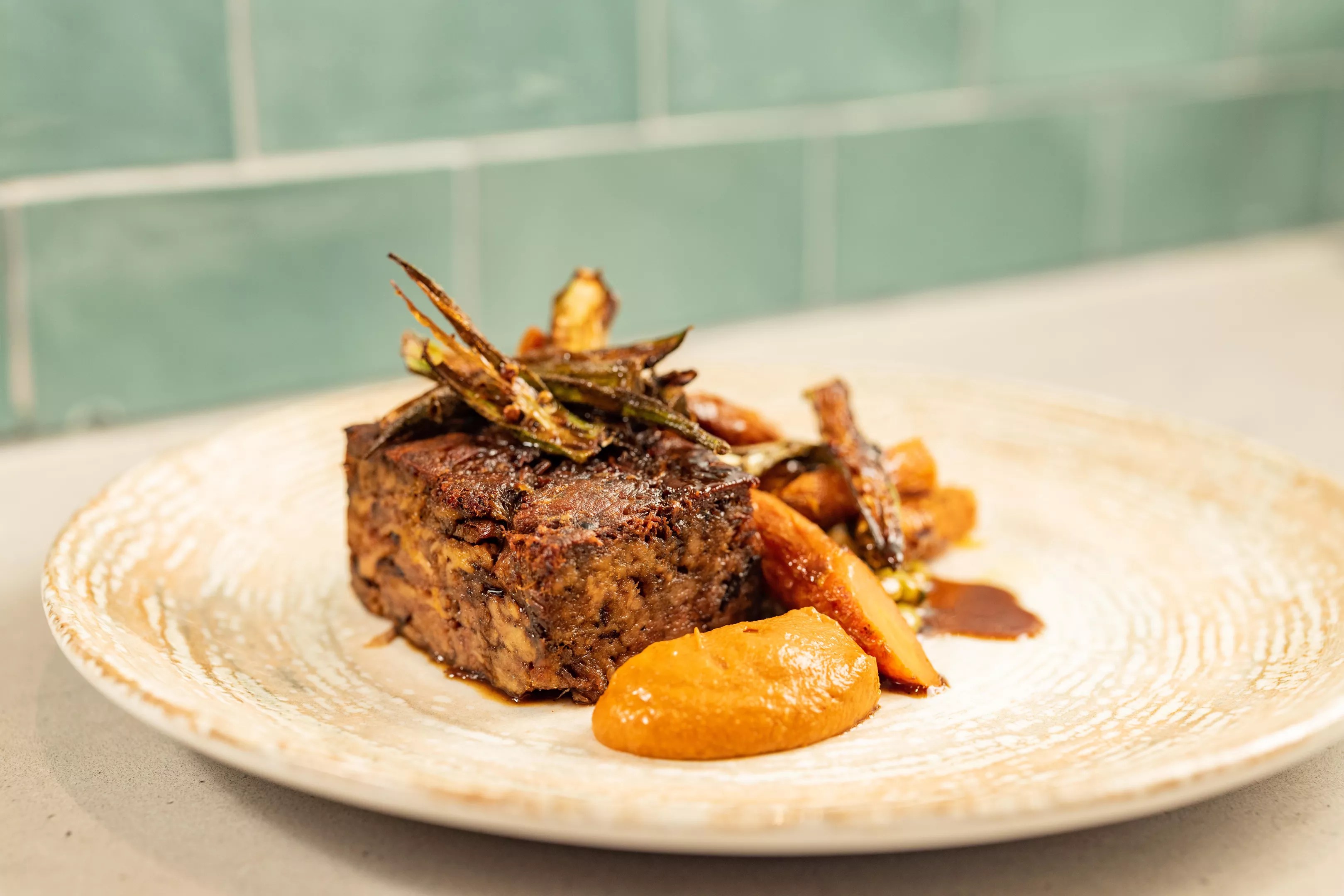 We were equally wowed by the lamb pressé we tried on our second visit. That dish is also a visual stunner, with a brick of braised lamb nestled against a pile of field peas, topped with Moroccan spiced carrots and charred okra. The dish comes with smoky and sweet muhammara dip that you’ll instinctively find yourself combing with bites of the tender and robust lamb that falls off with a gentle nudge from the fork.