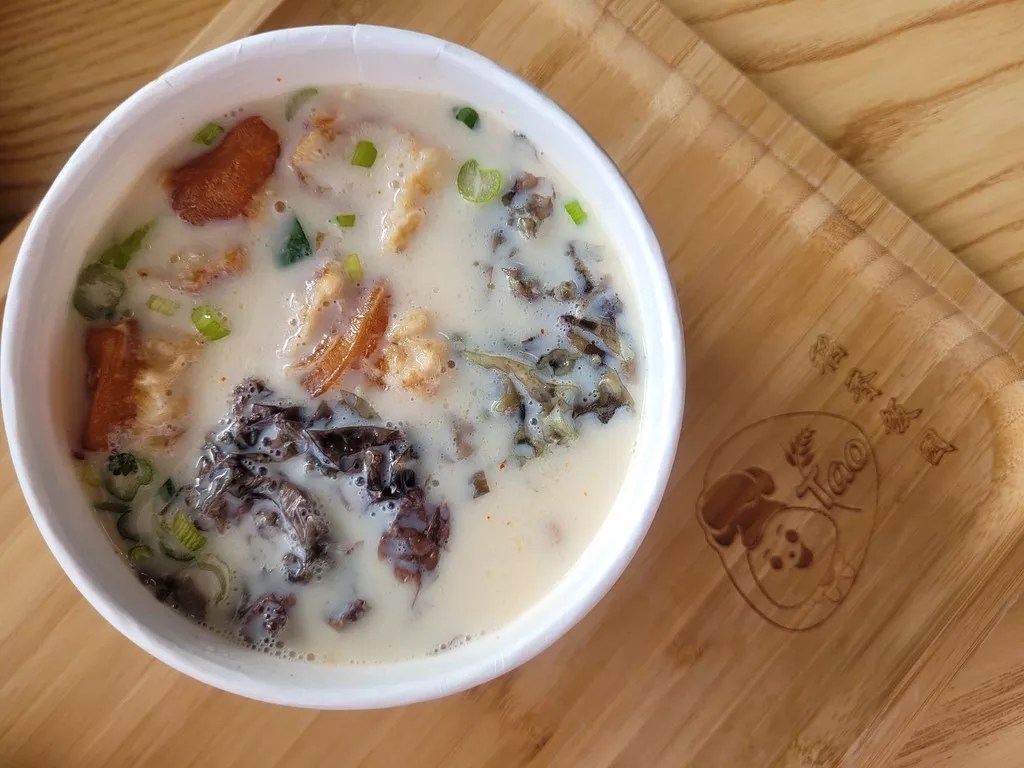 On a cold day, get a cup of hot and sweet soy milk. Or if you’re feeling curious, try the salted option, which is more a soup than a drink, a dairy-free, creamy savory soup accentuated by the texture of crispy youtiao, chewy seaweed and scallion. It’s best eaten hot and fresh for contrast in textures. You can get an iced soy milk as well.