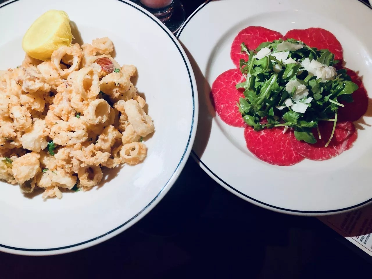 Two appetizers: A perfect plate of calamari along with beef carpaccio with arugula, gorgonzola and pickled onion.