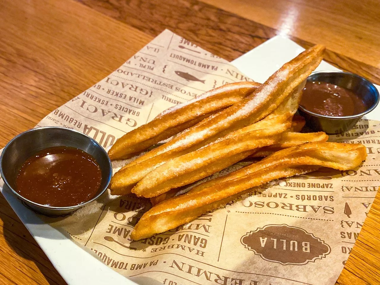 Churros con chocolate – Traditional fried dough, chocolate sauce, dulce de leche.
