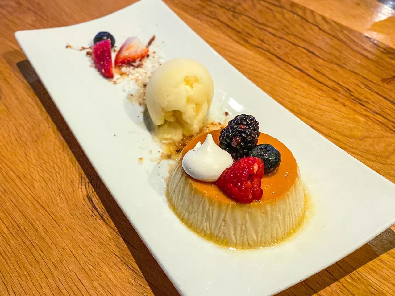 Flan de coco: coconut flan with passionfruit sorbet.