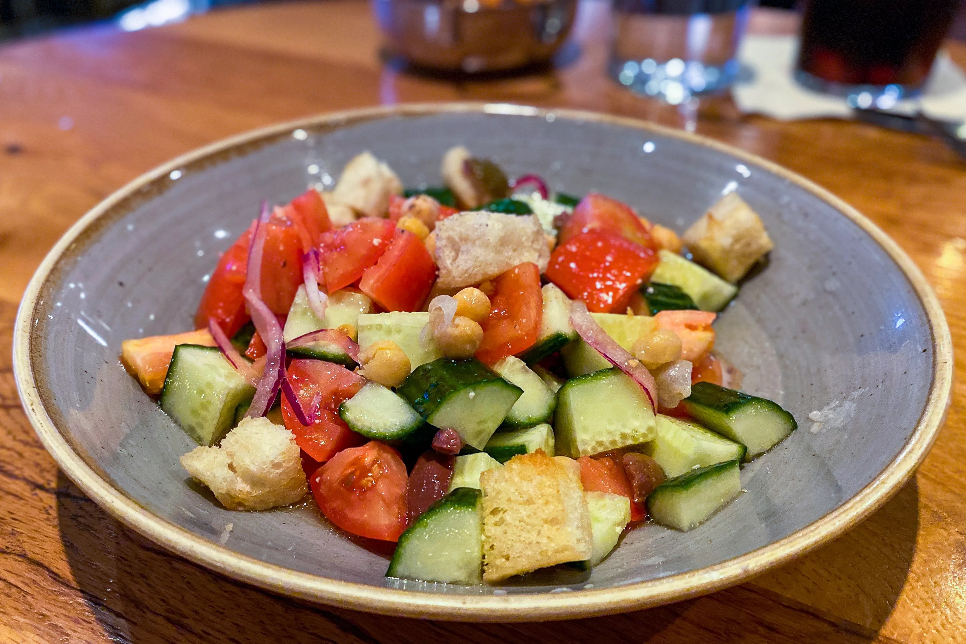 Mediterranean salad: Tomatoes, cucumber, chickpeas, olives, croutons, lemon, onion, EVOO.