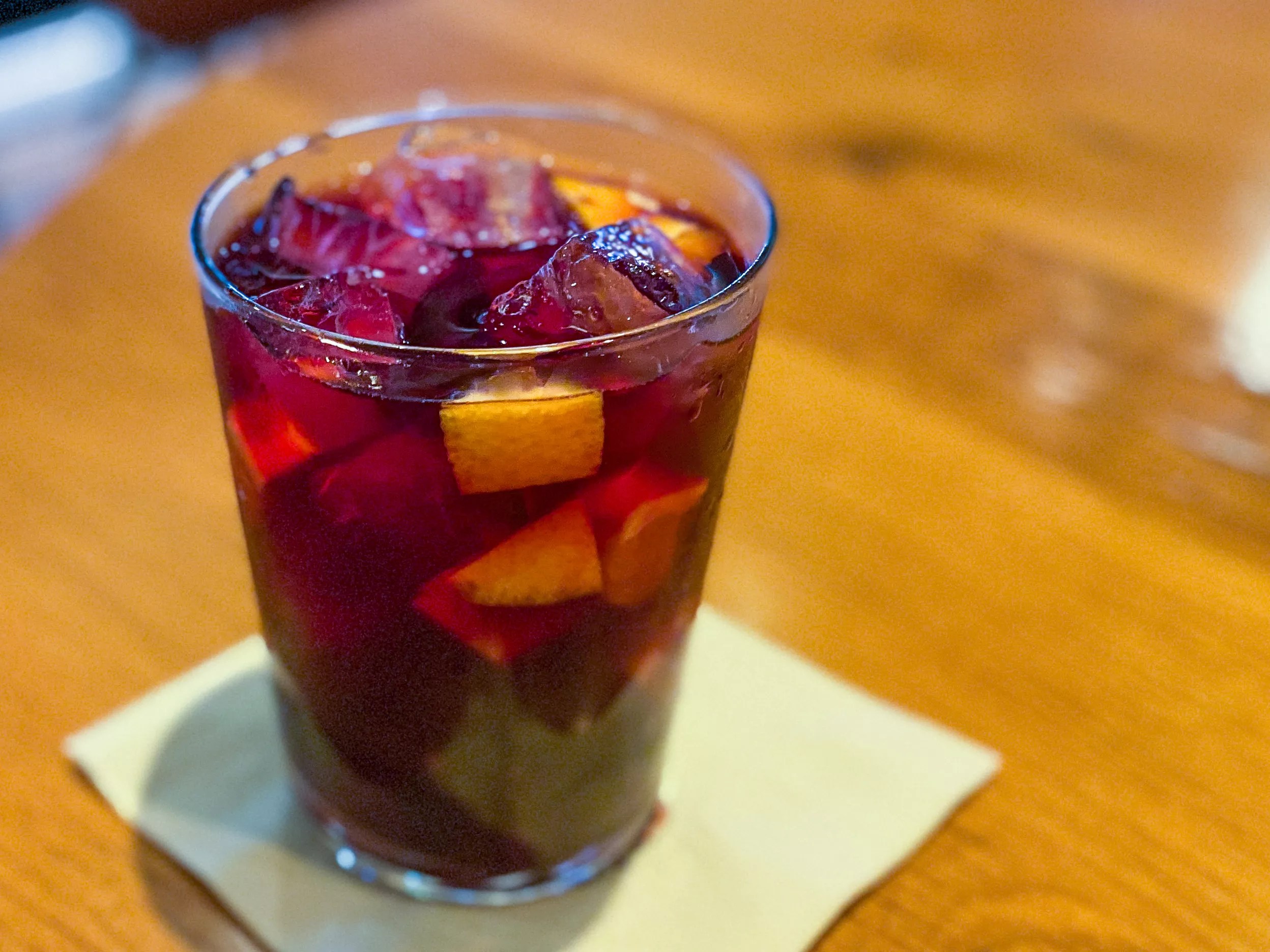 We started with a glass of the house sangría roja, a generous tumbler of red wine, brandy, Triple Sec, Sprite and chopped orange. Refreshing and not too sweet. We sipped these as we waited for our two smaller plates to arrive: our hot selection of patatas bravas and the cold Mediterranean salad.