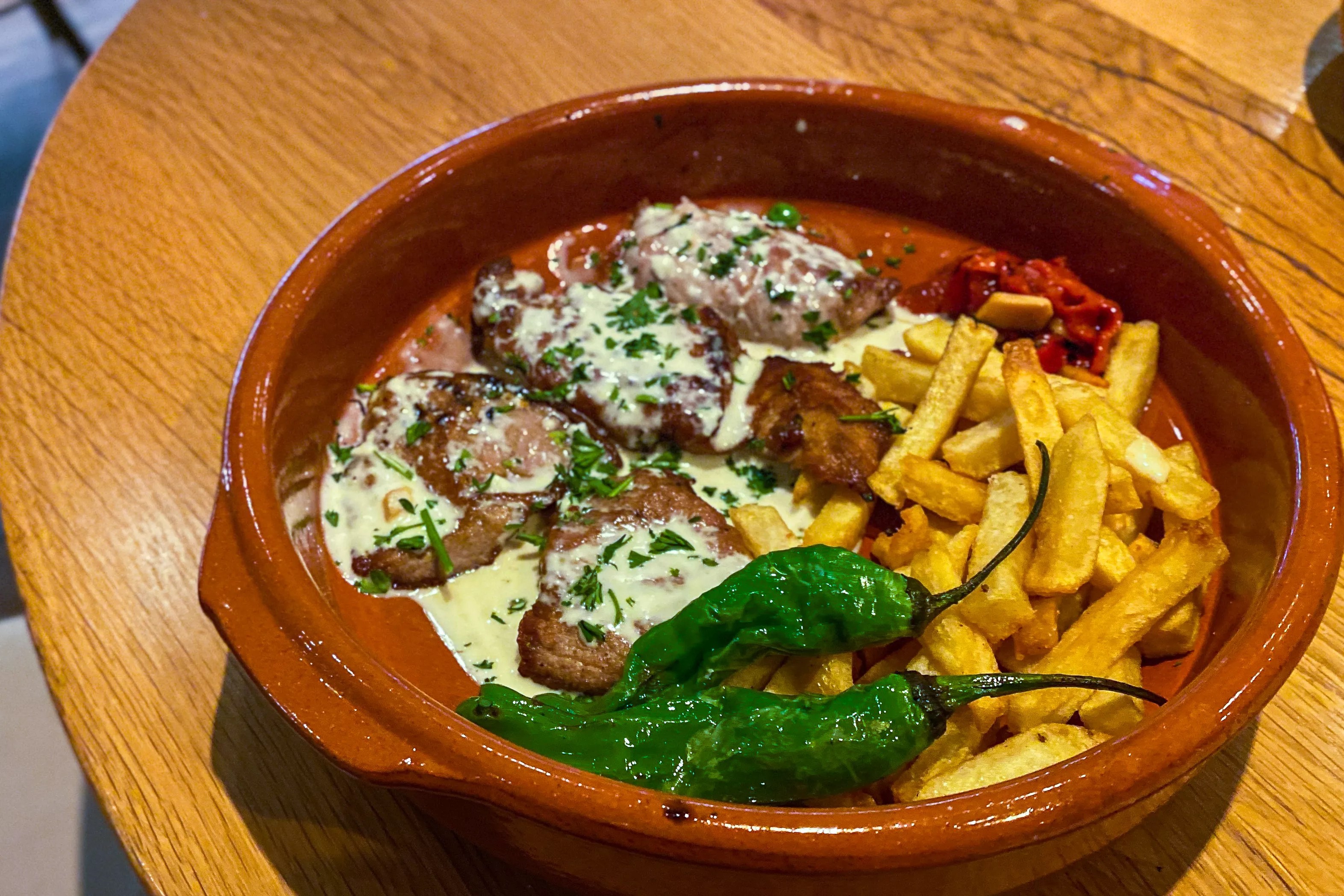 The first larger plate that arrived was the Solomillo with blue cheese sauce. This came to our table in a shallow earthenware bowl and had four or five small, extremely tender pork tenderloin pieces. The meat was covered with just the right amount of melted blue cheese sauce that was not overpowering, and was topped with a scattering of Italian parsley. A couple of grilled shishito peppers and some hand-cut fries rounded out the dish. The only thing missing was a hunk of bread that could have been used to sop up the last remnants of that wonderful sauce.