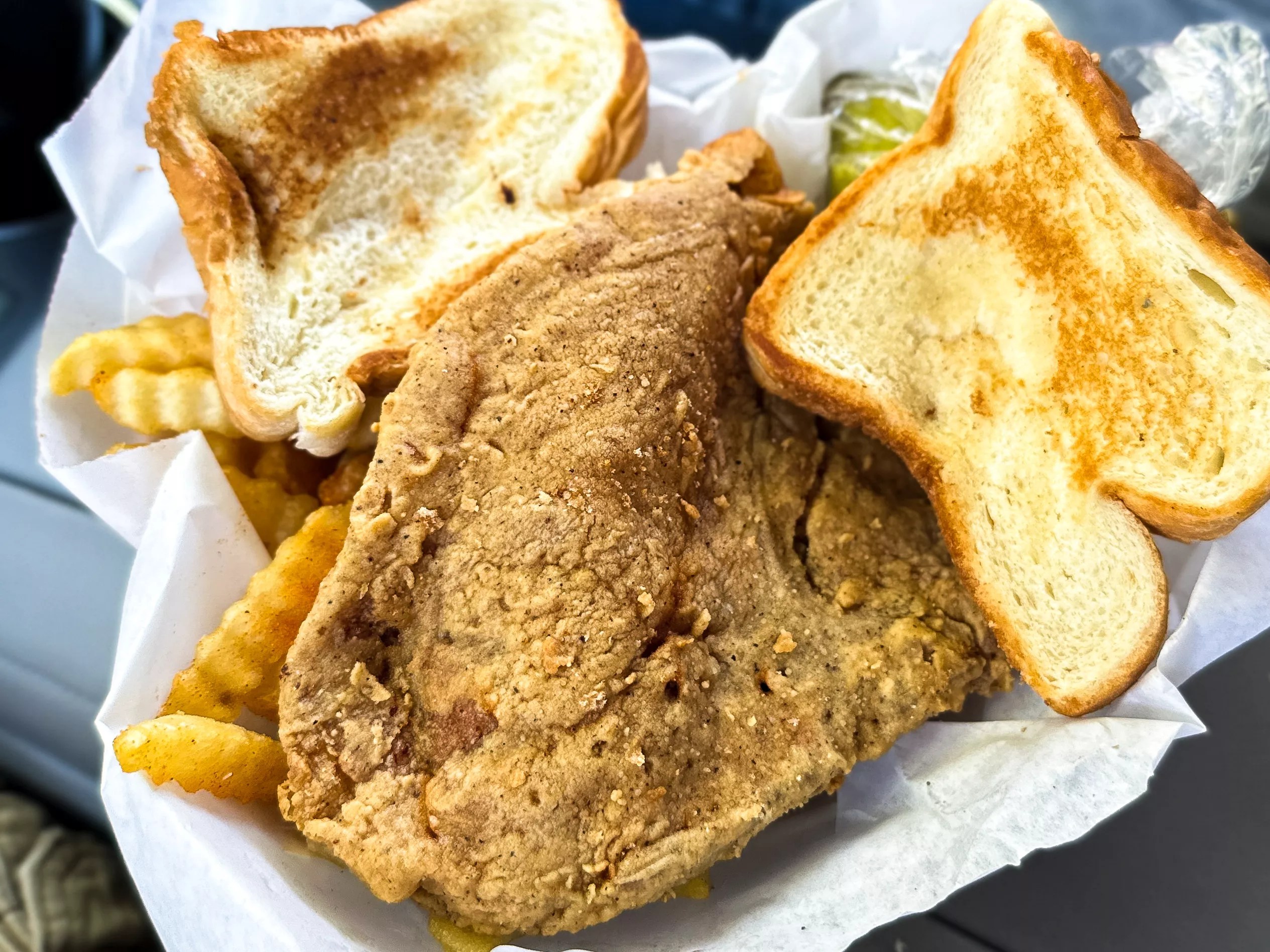 By Hank Vaughn Fried pork chop basket, with fries, toast, jalapenos and pickles from Big Daddy’s. Hank Vaughn