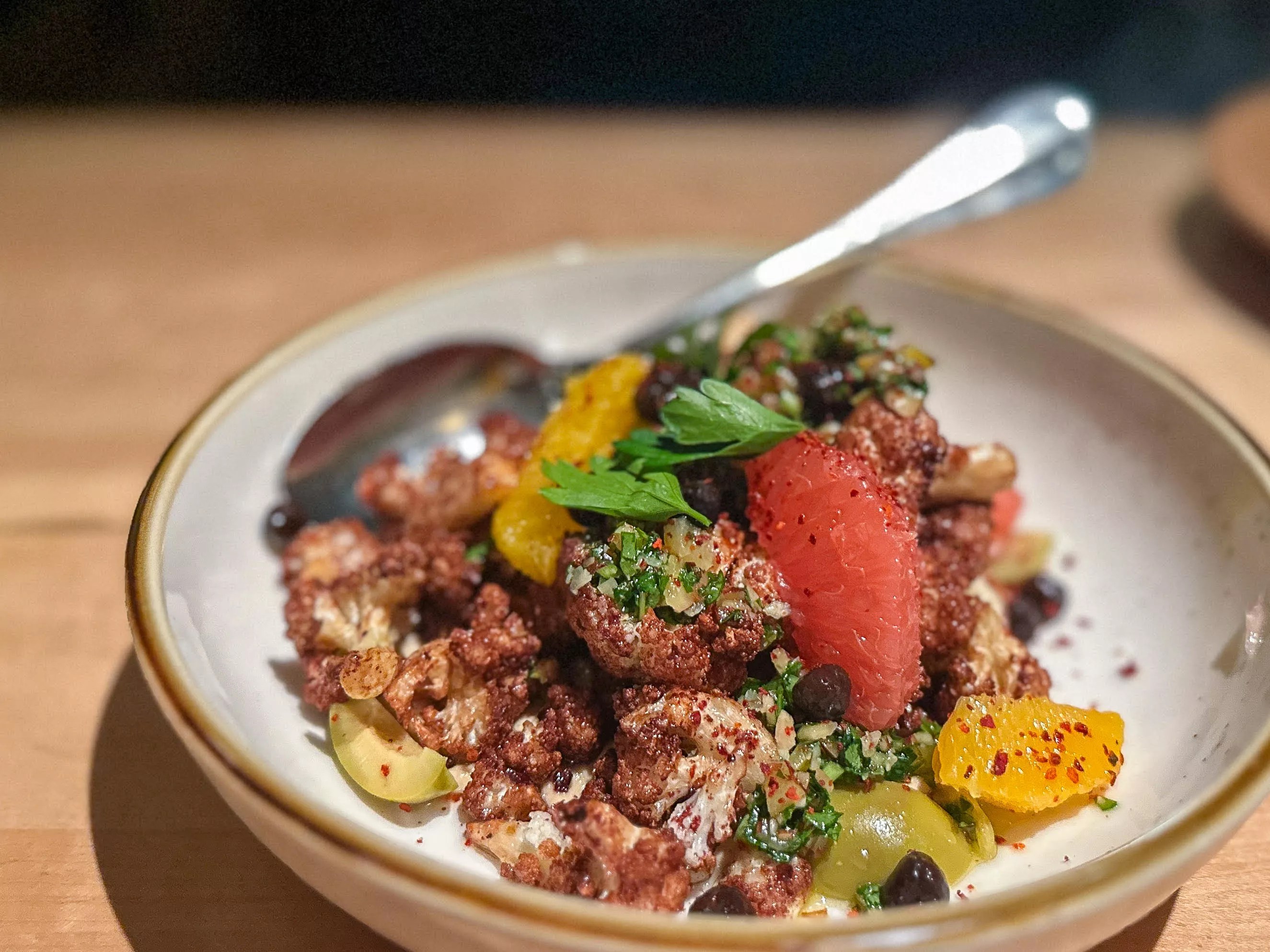 Sachet, 4720 Oak Lawn Hidden under the warm mezze section at Sachet (one of our Top 100 restaurants) is this lovely small dish of roasted cauliflower with grapefruit and oranges as well as olives, black chickpeas, hummus and almond gremolata. It’s a symphony of flavor, texture and temperature in every bite. – Hank Vaughn