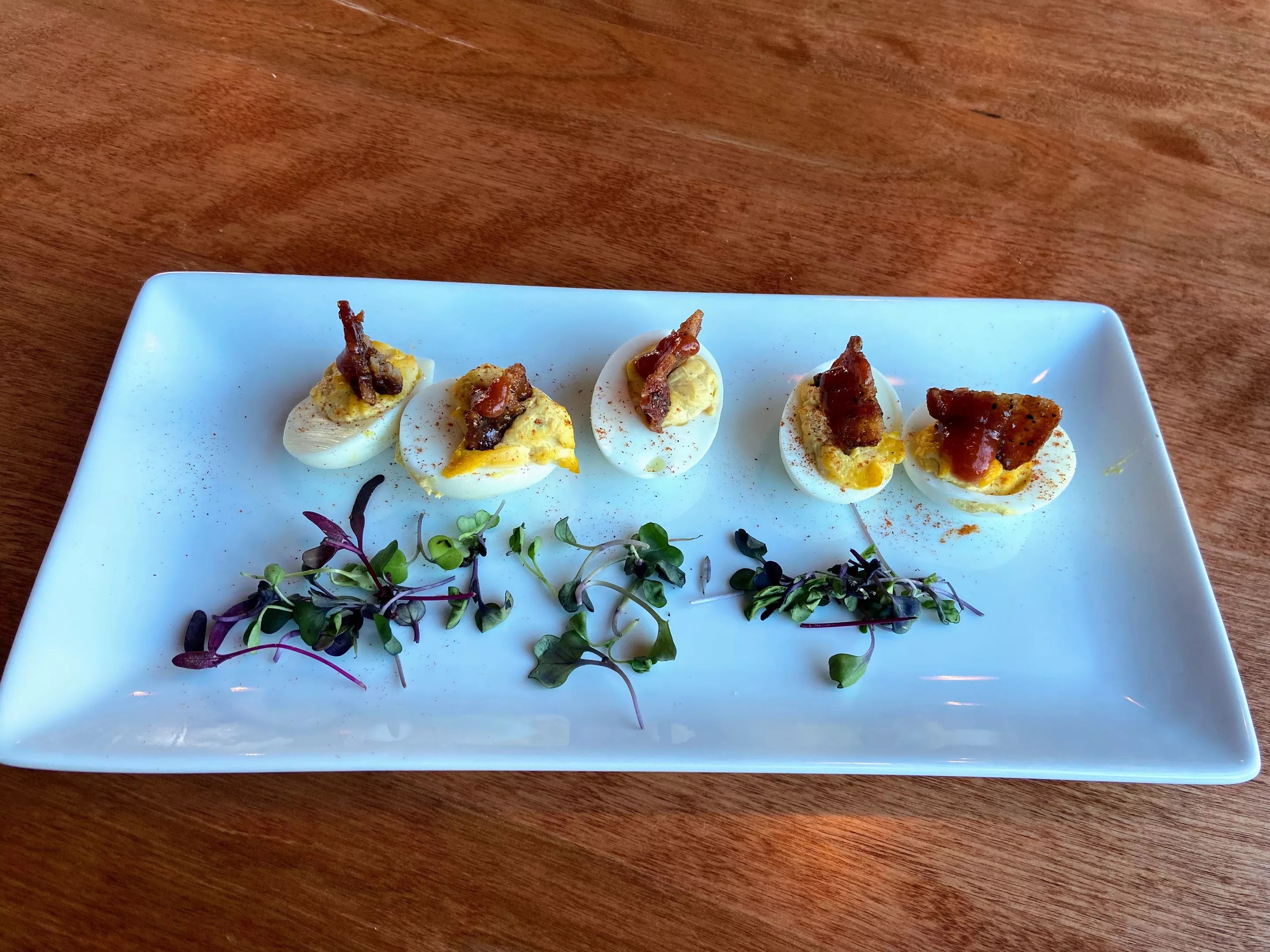 It always feels off when there’s an odd number of deviled eggs. However, these five topped with candied pork belly are only .
