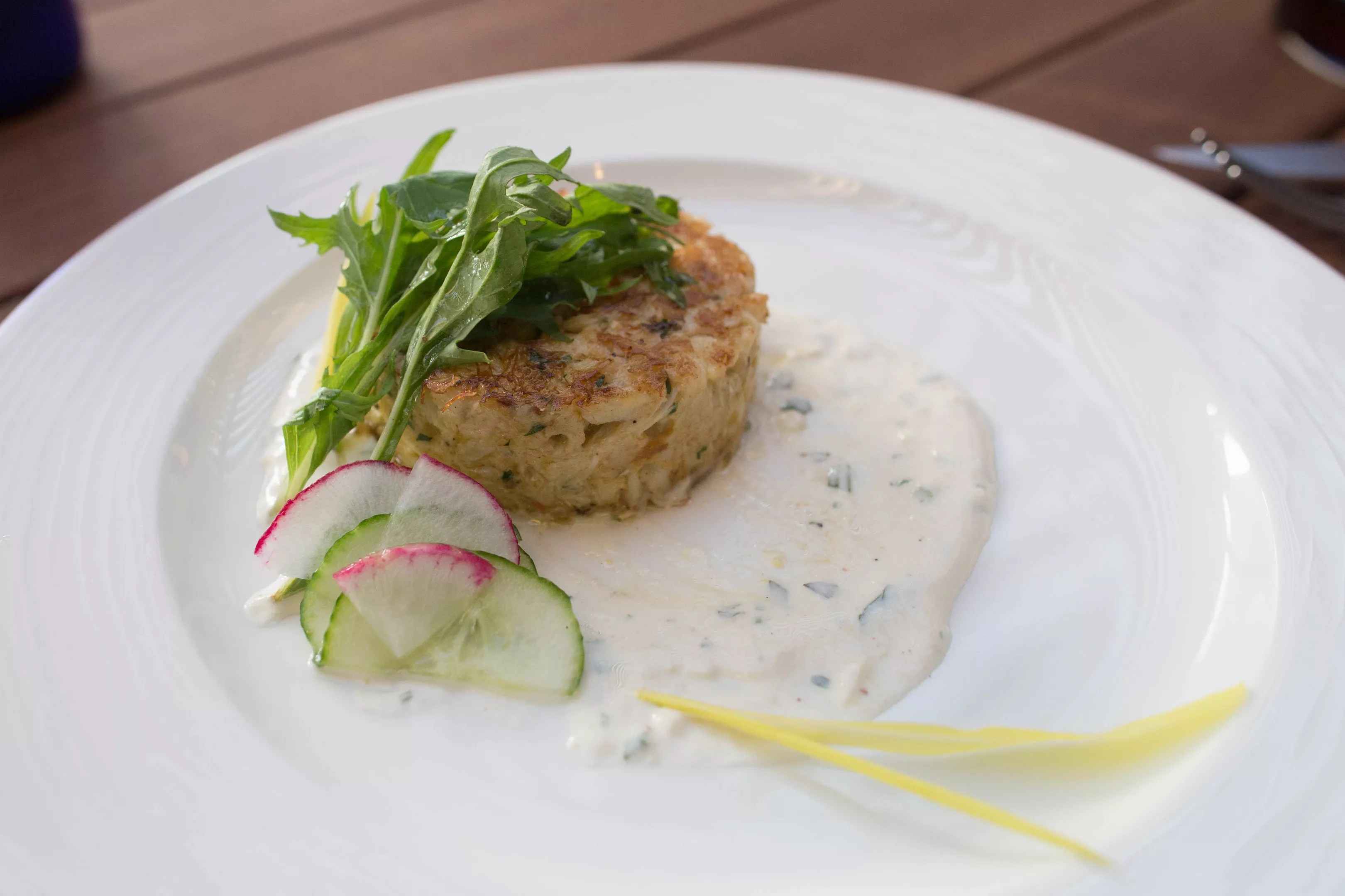 Menus are presented in a bound, iPad-like folio, and clicking on most items on the menu brings up a detailed description. We perused the cocktail menu and found a tiki-heavy list of drinks, from daiquiris to mai-tais. Our waitress informed us that all cocktails are made with fresh ingredients, with a focus on fresh fruits, and syrups, juices and mixers made in house. The Keeper’s house-blended rum selections were intriguing. The Navy-strength old fashioned ($14) made with the house dark rum was a pleasant alternative to the usual bourbon old fashioned. The lump crab cake at The Keeper is … well … a keeper (damn it). Chris Wolfgang