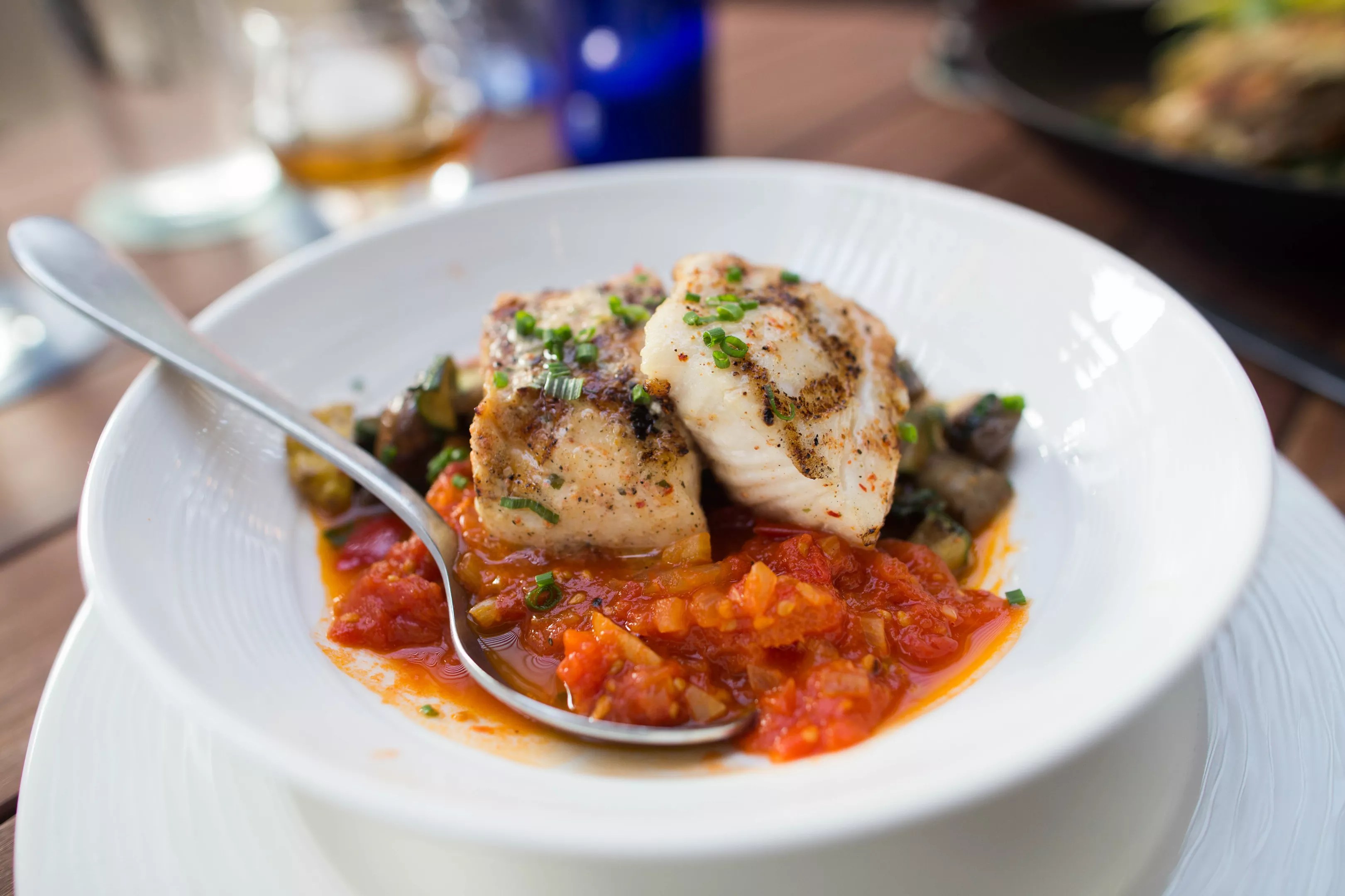Our waitress suggested the crab cake ($15), which came with large chunks of crab blended with bits of sweet corn, seared, then served with a green goddess dressing. The fresh crab had us looking forward to the rest of the seafood menu. With fresh fish flown in daily, The Keeper had us covered. We tried the sable fish ($27), which was served with a chunky tomato broth and a blend of fresh grilled vegetables. The oily whitefish was the acme of freshness and perfectly grilled to order. Sable fish with a chunky tomato broth and grilled vegetables was the acme of freshness. Chris Wolfgang