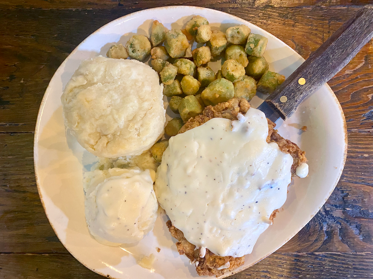 Besides, we were initially lured there by the chicken-fried steak. Here the quintessential Texas dish is called A Lil Bit of Chicken Fry ($18), and it’s an 8-ounce black Angus steak from 44 Farms served with mashed potatoes and covered in a black-pepper gravy accompanied by a huge buttermilk biscuit and fried okra. The meat had a tinge of pink in the middle, which was great by us, and the crispy and thick crust was a perfect canvas for the well-seasoned gravy. The fried okra was a touch al dente inside with a thin, crispy crust.