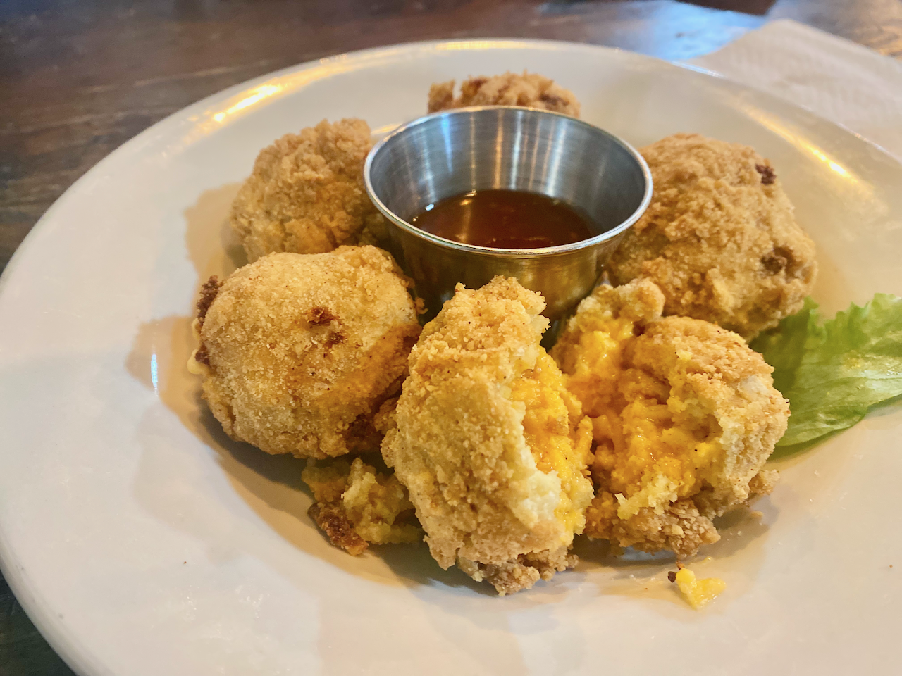 We started with an order of fried pimento cheese balls ($6), which were served with a sweet chile sauce. These larger-than-golf-ball gooey orbs come five to an order and are encased with a thick cornmeal crust. They use the Pawley Island brand of pimento cheese for these, which is a small specialty food purveyor out of South Carolina. These were amazing and gave us great hope for the remainder of the meal.