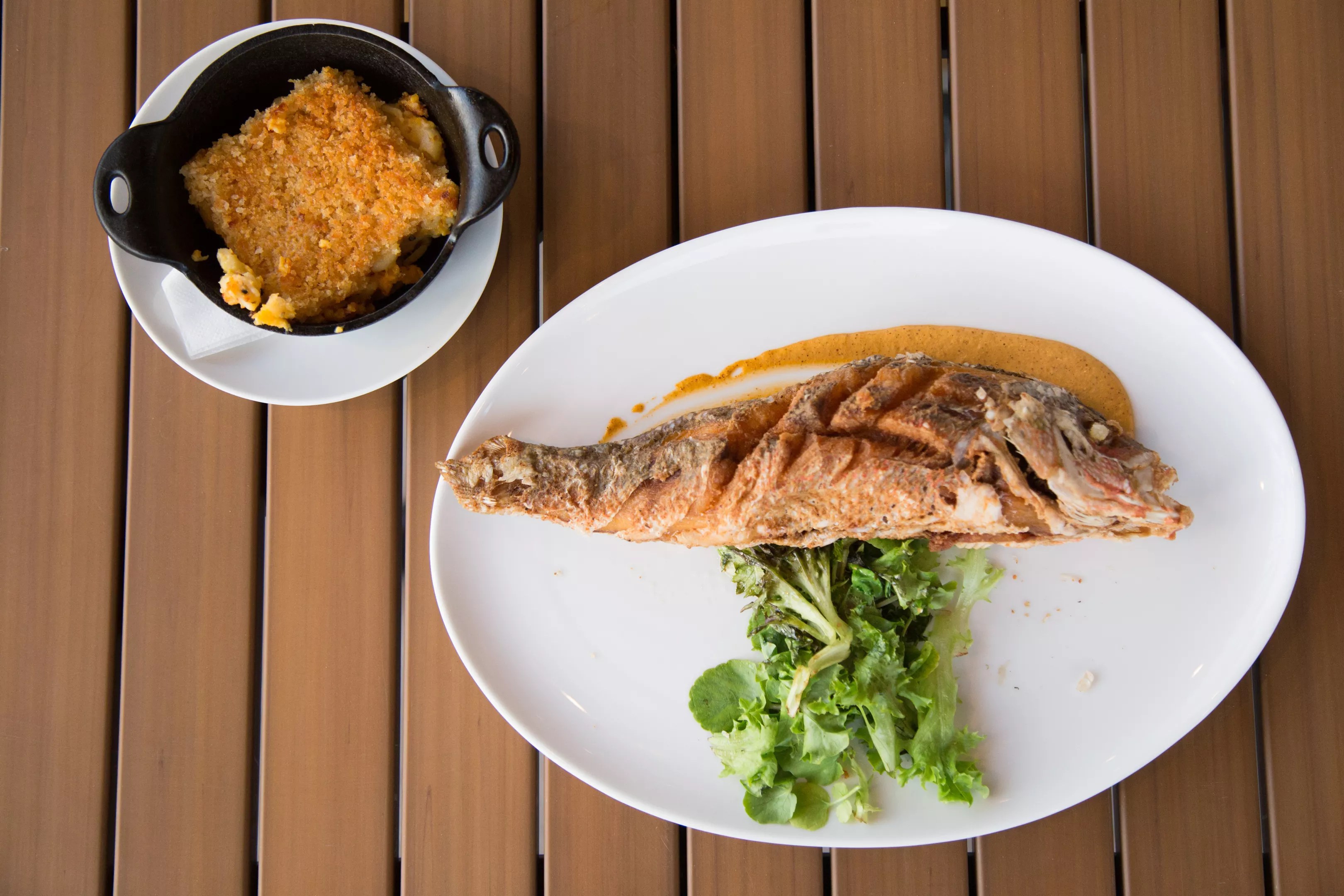 With 10,000 square feet indoors and another 2,000 square feet on the patio, Tupelo Honey is indeed a big establishment. Curiously, it doesn’t feel that large; the interior space is divided into several rooms that give off a much cozier vibe. The decor will feel familiar to anyone who has watched HGTV’s Fixer Upper, with lots of wood floors, high ceilings and light-colored walls. The sprawling patio features a bar and wraps around two sides of the building.