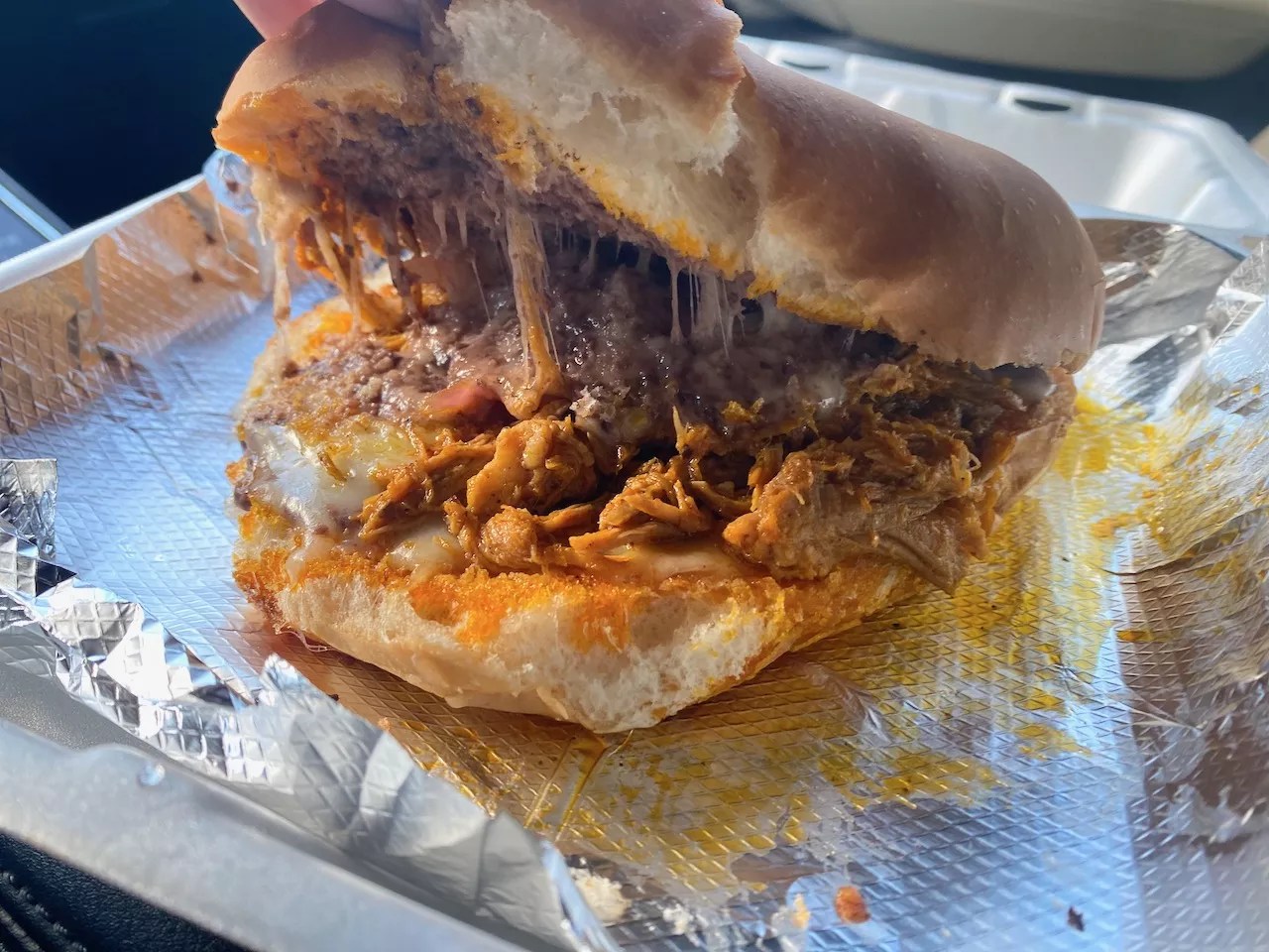 We ordered a plate of five different tacos with a variety of flavored tortillas. The plate is a vibrant combination of vegetables and mounds of flavorful protein, speckled with dollops of guacamole and cubes of mango. We also got a  Puerto Rican-style torta de pernil with slow-roasted pork that was a sandwich we won’t soon forget.