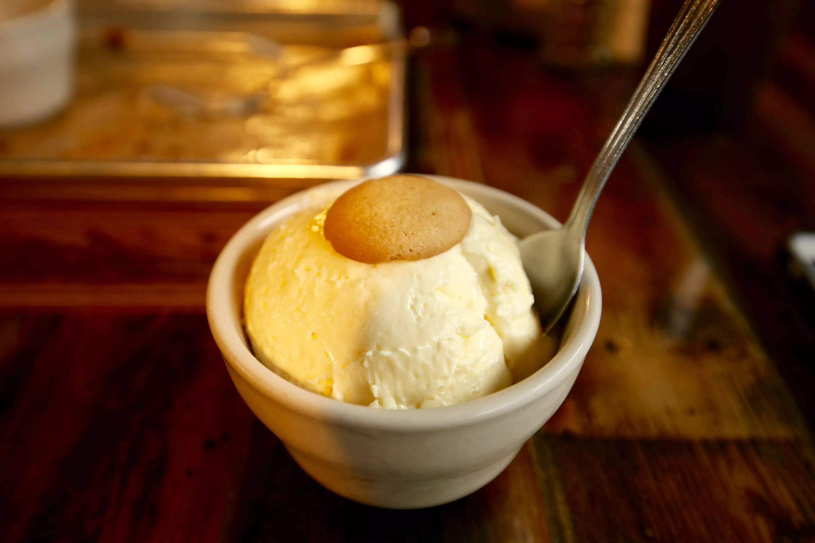 Banana pudding, so thick that the spoon stands up straight, is kept chilled until you’re ready to eat it.