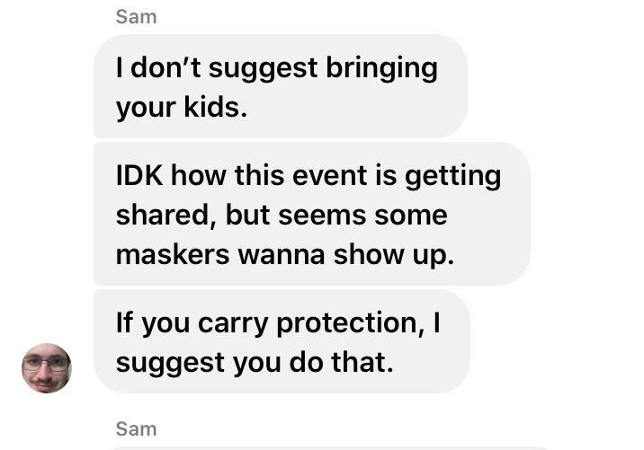 The followers who clicked “Going” received private messages from Walker in a Facebook Messenger group. The Dallas Observer was able to obtain screenshots of the conversation leading up to and during the protest.