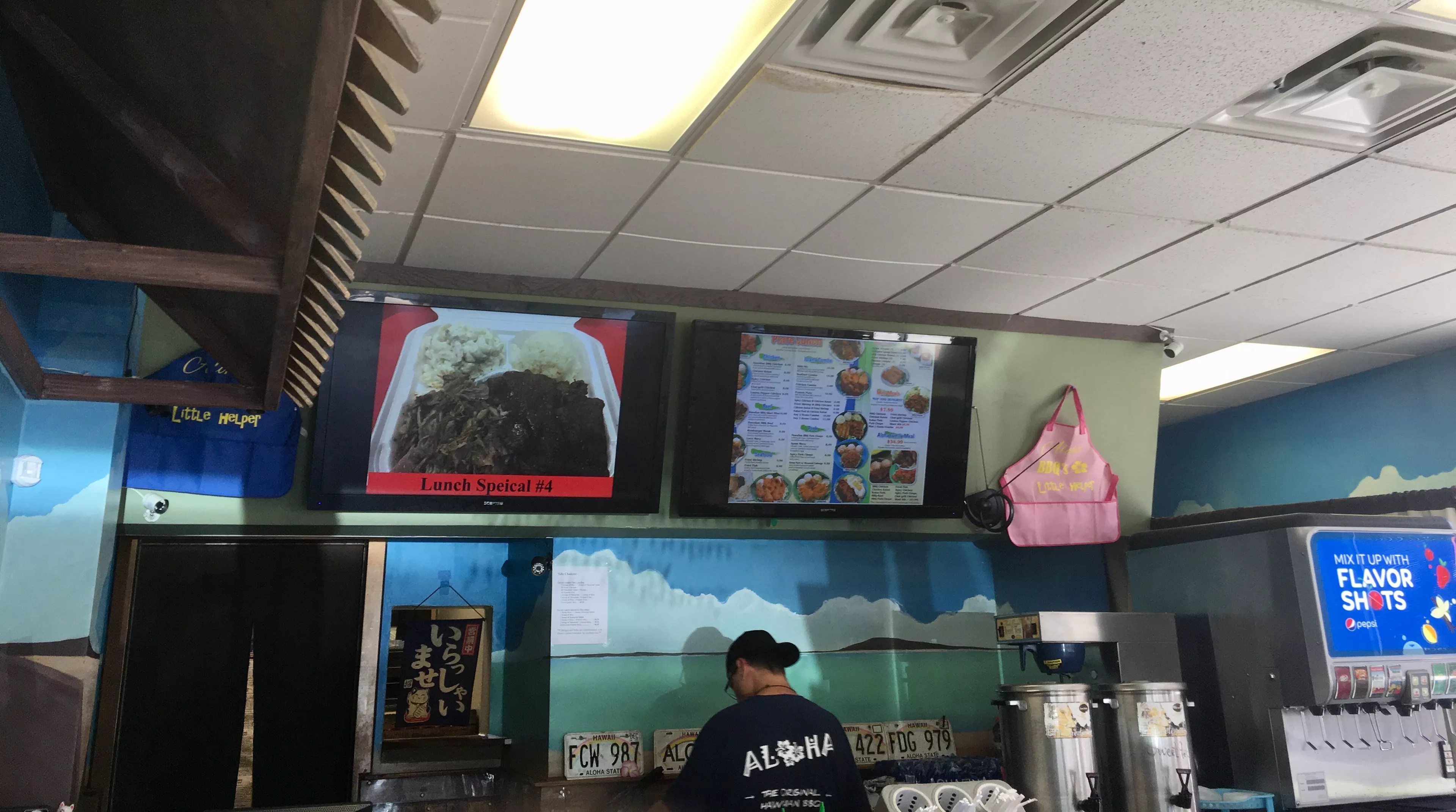 During a quick lunch, Dallas has disappeared. Cases of Hawaiian Sun, the island’s ubiquitous tropical fruit juice, are stacked high behind the counter. Aloha soy and katsu sauces, sweet and vinegary, are ready for you in coffee thermoses – the kind you pump for hot java at the office. The grill hisses behind a hallway blocked by vinyl slats; Aloha is not interested in decor or presentation beyond comfort in the form of heaping piles of fast, hot food. Portions are enormous. Murals on the wall, turquoise and sunflower yellow, showcase amateur hand-painted beaches and mountains.