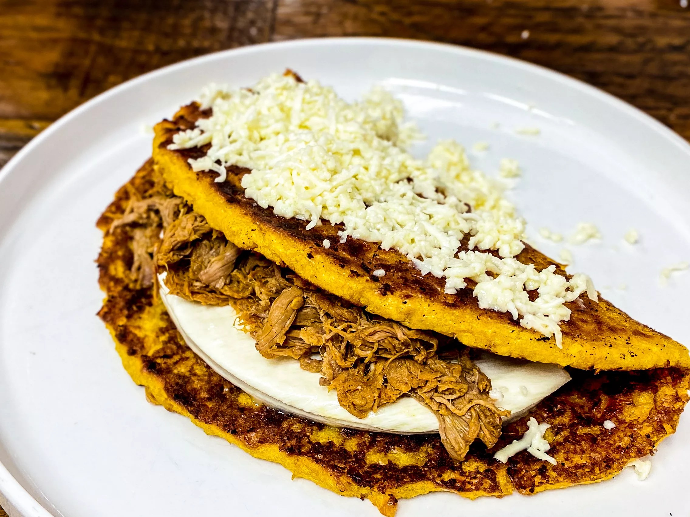 Arepas Venesuela: shredded chicken, shredded meat, pork, avocado and cheese in a white corn cake