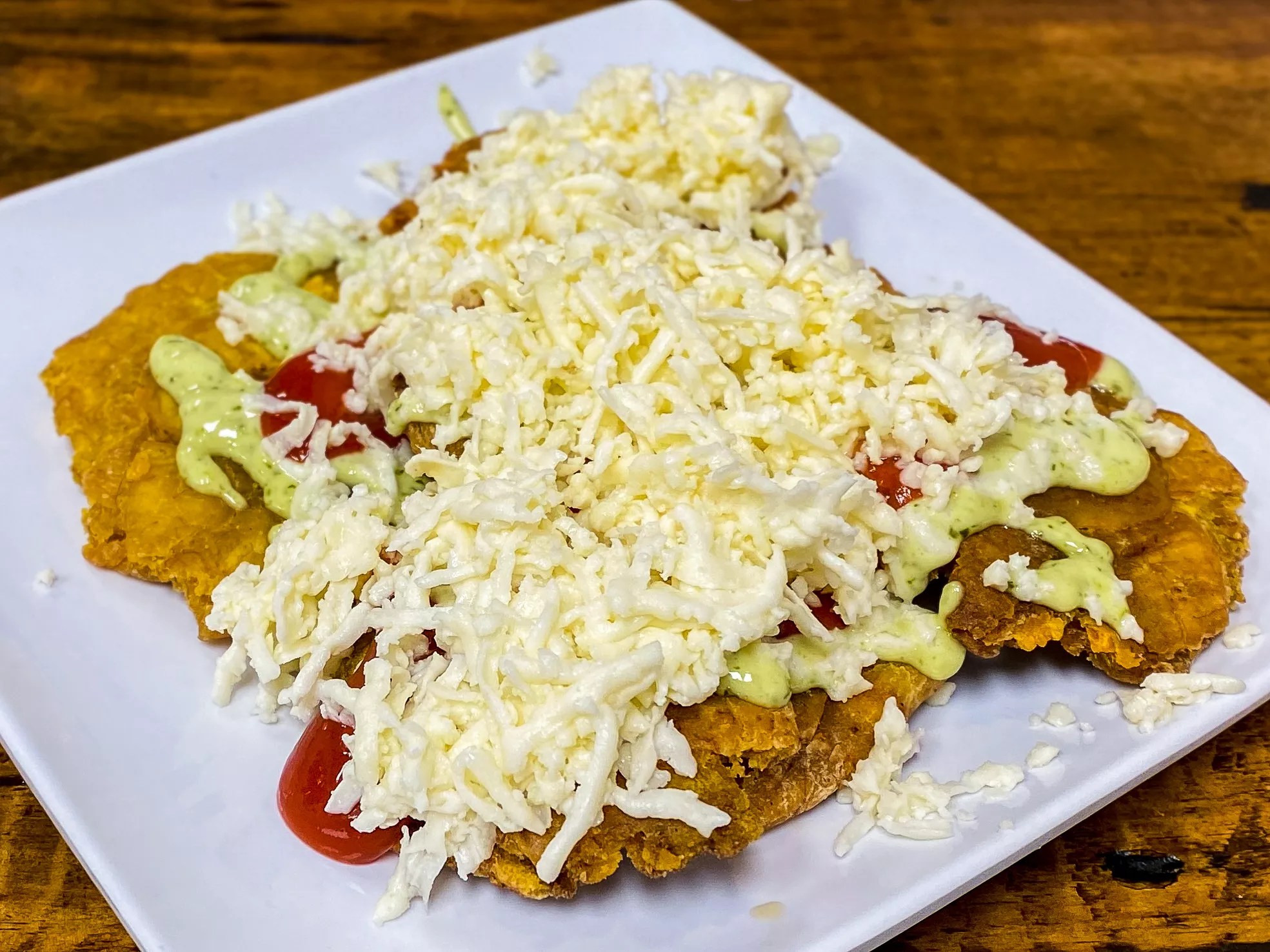 Tostones with cheese: fried plantains with shredded queso blanco and salsas