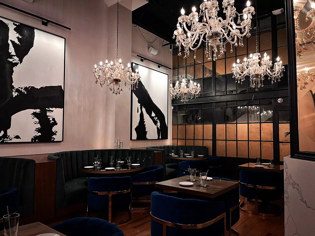 We see the reason behind the buzz. Behind an unassuming exterior, the entrance unfolds into a chic chandelier-adorned lounge, dressed in royal blue lounge chairs and bathed in elegant lighting. Soft neon hues cast a pink glow on flower-decked walls, while whimsical neon signs such as the ‘No Money No Honey,’ beckon for impromptu selfies.