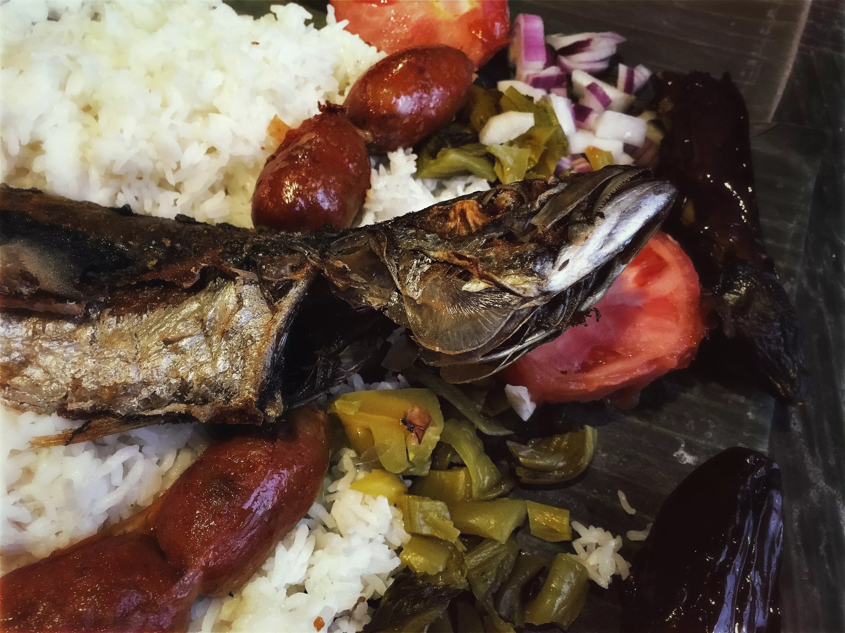 A whole fried red snapper, longanisa sausage, pickled cabbage, charred Japanese eggplant, grilled tomatoes. Just a small portion of a much larger meal.